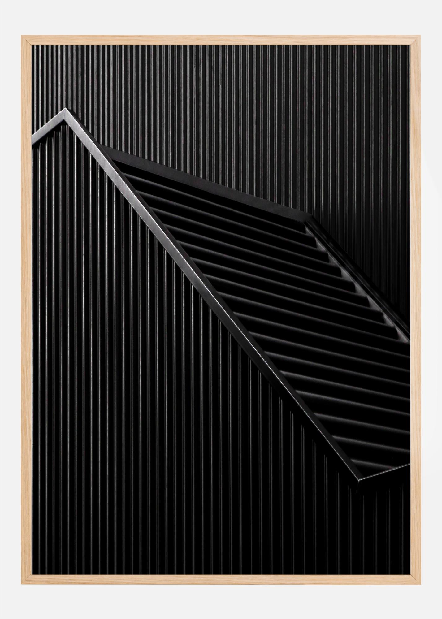 Geometrijski poster z naborom stopnic ali strehe proti steni. Ta črno-bela fotografija spominja na Escherjevo sliko. Sledi linijam lesene konstrukcije, medtem ko seka v različnih kotih okoli dela za fantastičen spektakel. Postavite to sliko na belo steno za še bolj dramatičen učinek.