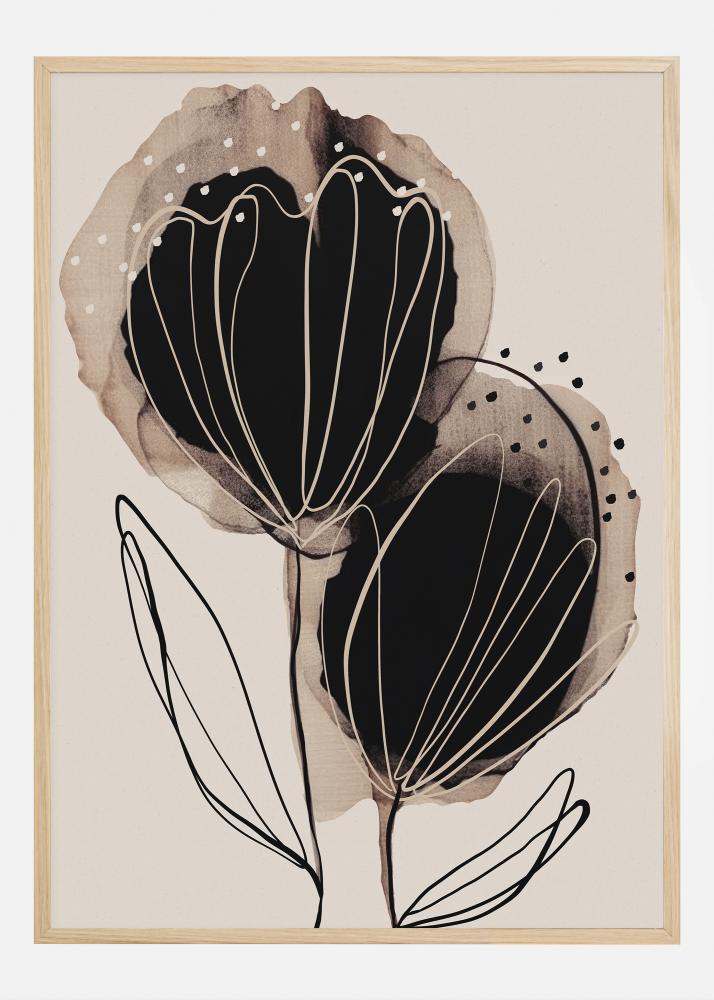 Raziščite dramatičen in umetniški izraz naše abstraktne cvetlične posterje. Ta edinstven plakat vzbuja močan občutek elegance in kontrasta s svojimi drzno črnimi konturami, ki prikazujejo silhuete cvetov. Abstraktna cvetlična tema je prefinjeno upodobljena z ozadjem v mehkih sepija in bež odtenkih, ki ponujajo toplo in vabljivo ozadje močnim črnim detajlom.
