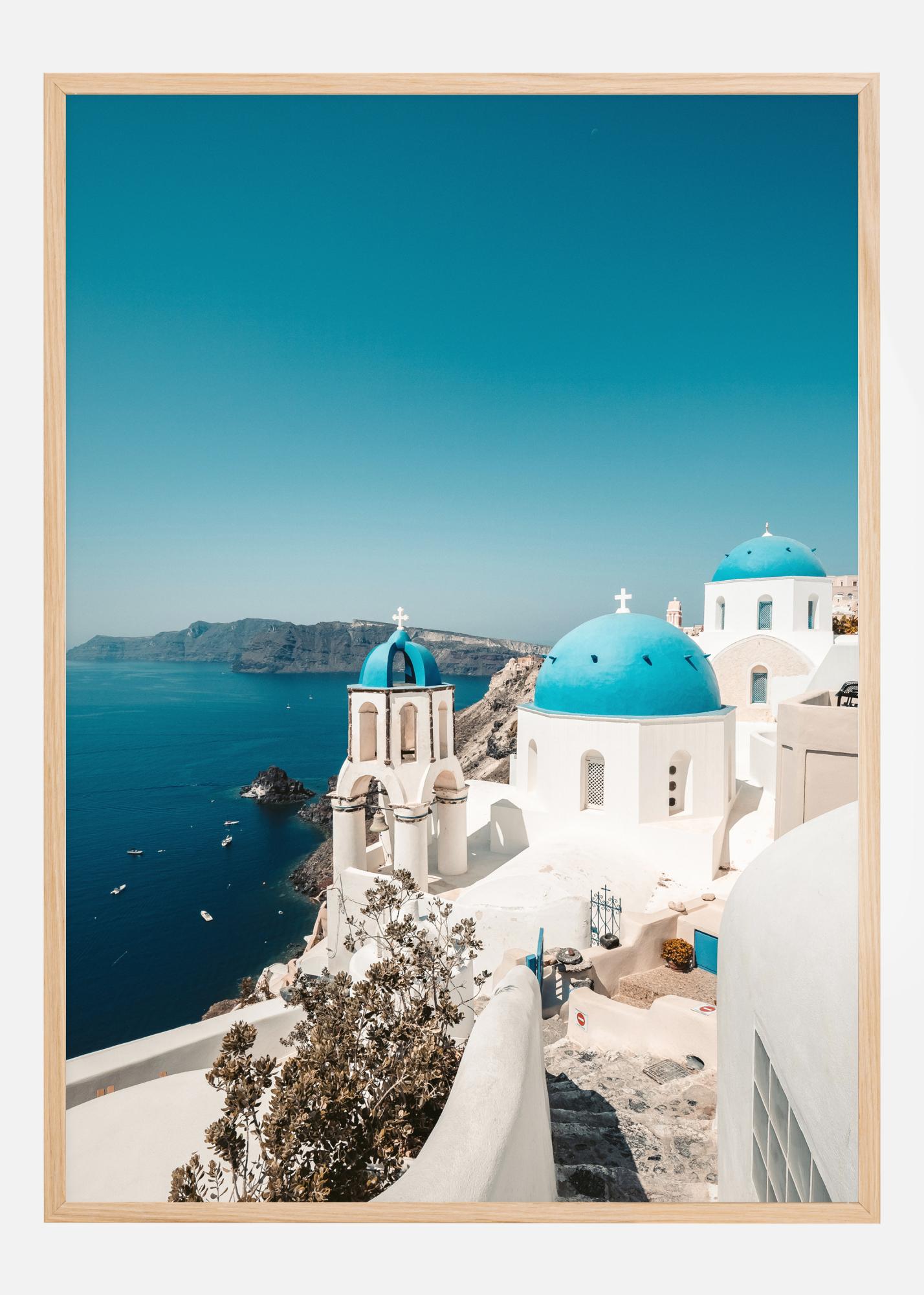 Svetel plakat z majhnim grškim obalnim mestom in globokim modrim morjem. Vse stavbe so čudovito bele, z modrimi kupolami, ki se ujemajo z svetlo modrim morjem in nebom. Predstavljajte si, da je to vaš balkon in vaš pogled skozi okno, ko obesite to sliko na steno doma.