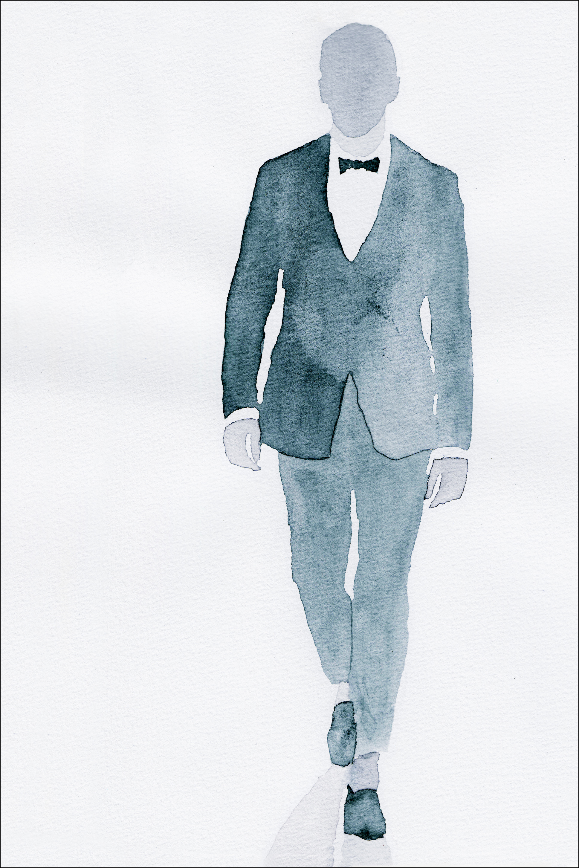Portretni plakat z moškim v smoking obleki, ki hodi. Preprosto, a vseeno učinkovito, ta modra slika prikazuje figuro, vendar brez prikazovanja podrobnosti. Kdo je skrivnostni moški? Na tebi je, da odločiš, ko sliko obesiš doma.