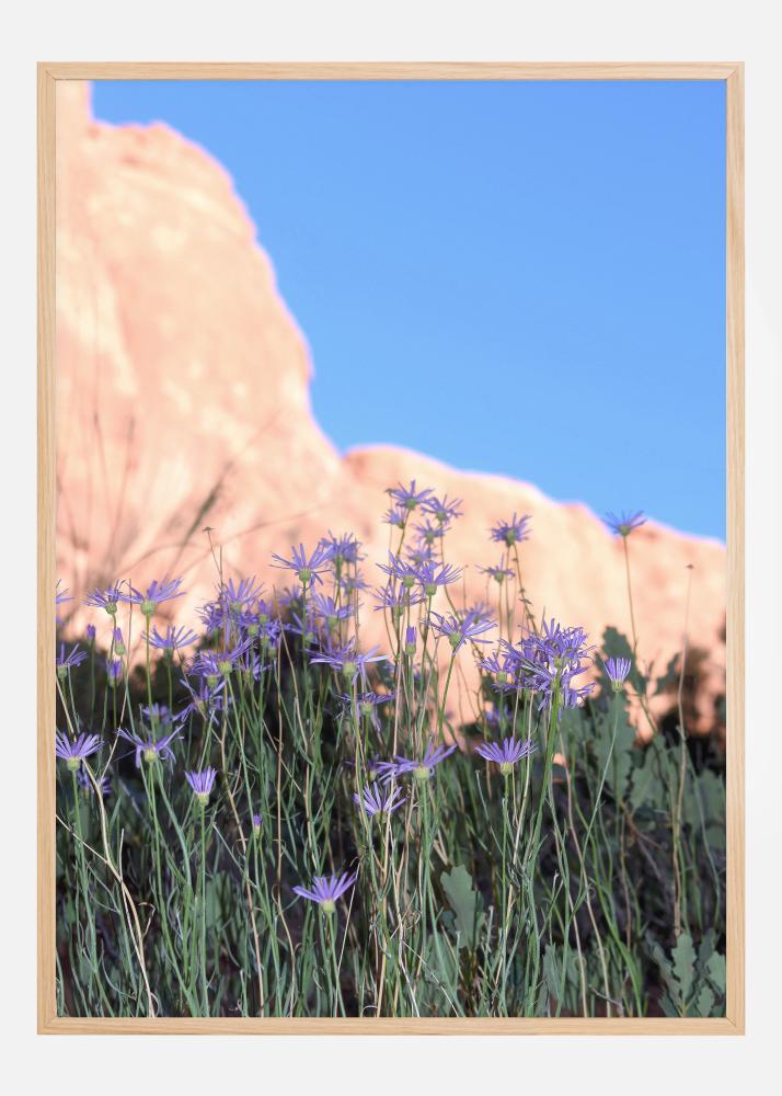 Osupljiv naravni poster z vijoličastimi cvetovi, skalnatimi gorami in močno modrim nebom. Vijoličasti cvetovi so v ospredju in se raztezajo proti nebu, medtem ko oranžna gora tvori mejo širokega prostranega neba. Pustite se izgubiti v naravi, ko prinesete to delo domov in ga obesite v svojo spalnico.