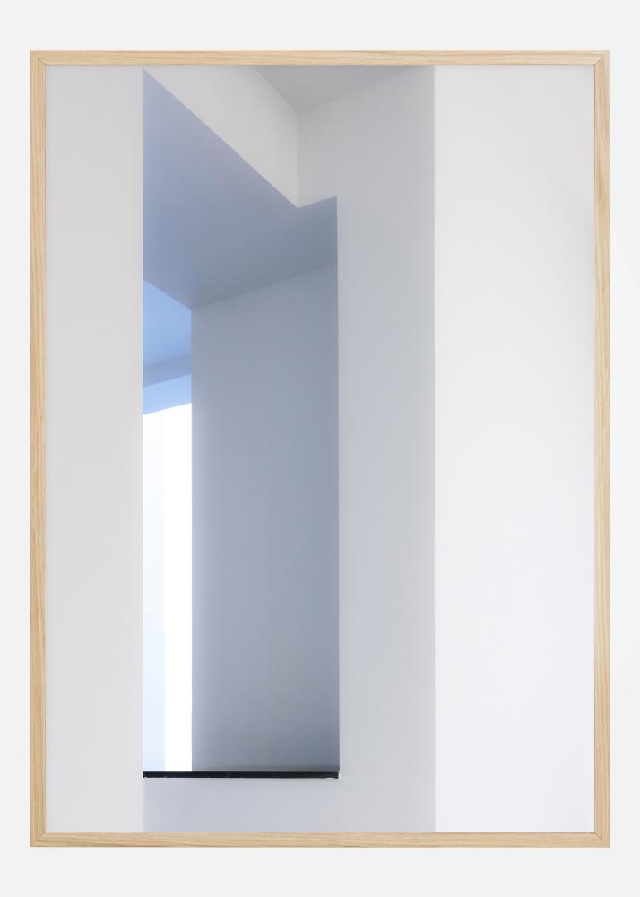 Notranji plakat z zidovi in oknom. Bele in sive stene ter geometrijske oblike vodijo pogled proti oknu, kjer je svetla bela stena in modro nebo zunaj. Obešajte to sliko v nekoliko temnejšo sobo, da dobite občutek in iluzijo svetlobe in prostora.