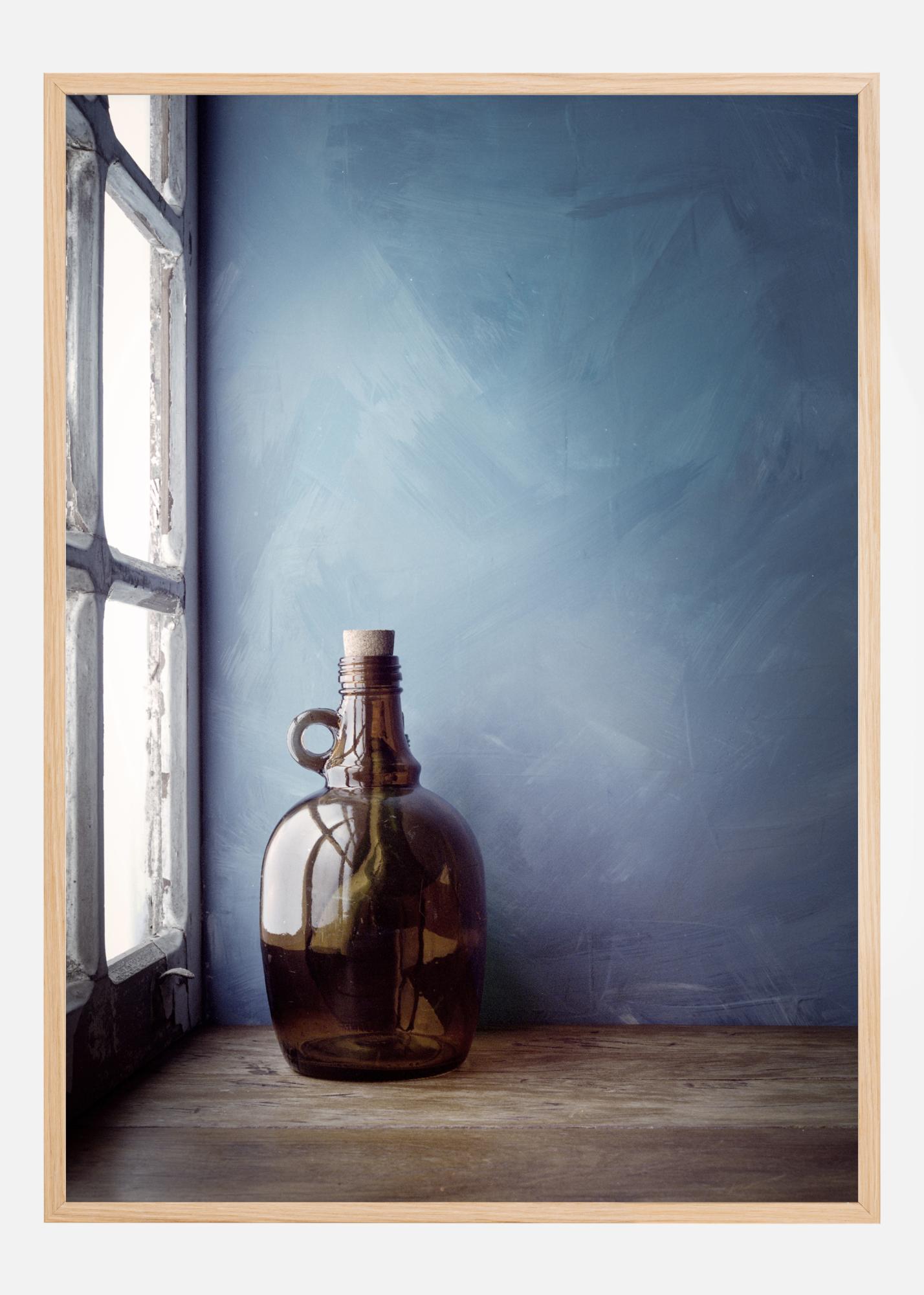 Plakat tihožitja z rjavo steklenico ob modri steni. Svetloba iz okna prihaja z leve strani in osvetljuje steklenico ter ustvarja odseve. Dodajte rustikalni pridih svojemu domu z mehko modro steno in staro leseno mizo, na kateri stoji steklenica.