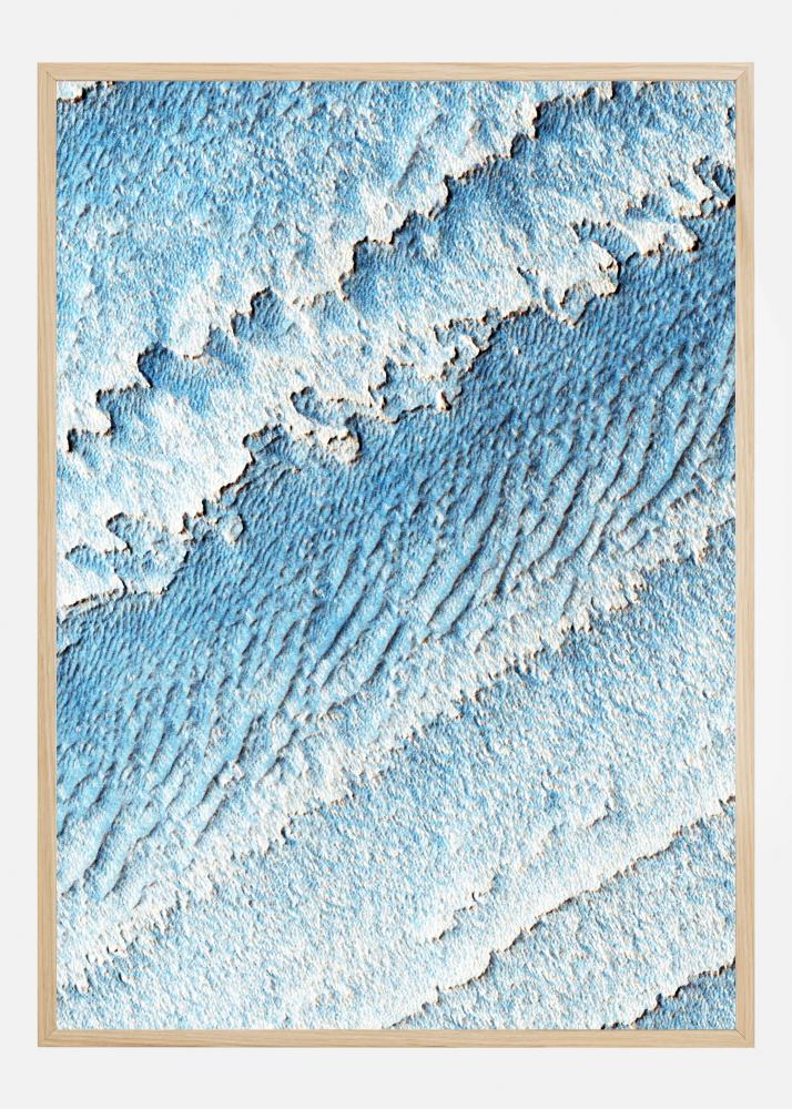 Plakat z zračno fotografijo, ki prikazuje valove, ki udarjajo proti obali. Bele peneče črte v vsakem valu, medtem ko voda valovi in se približuje kopnemu. Svetlo modra in azurno obarvana področja naredijo to drzno podobo. Združite z oranžno steno, da dosežete poln učinek s temi dopolnilnimi barvami.