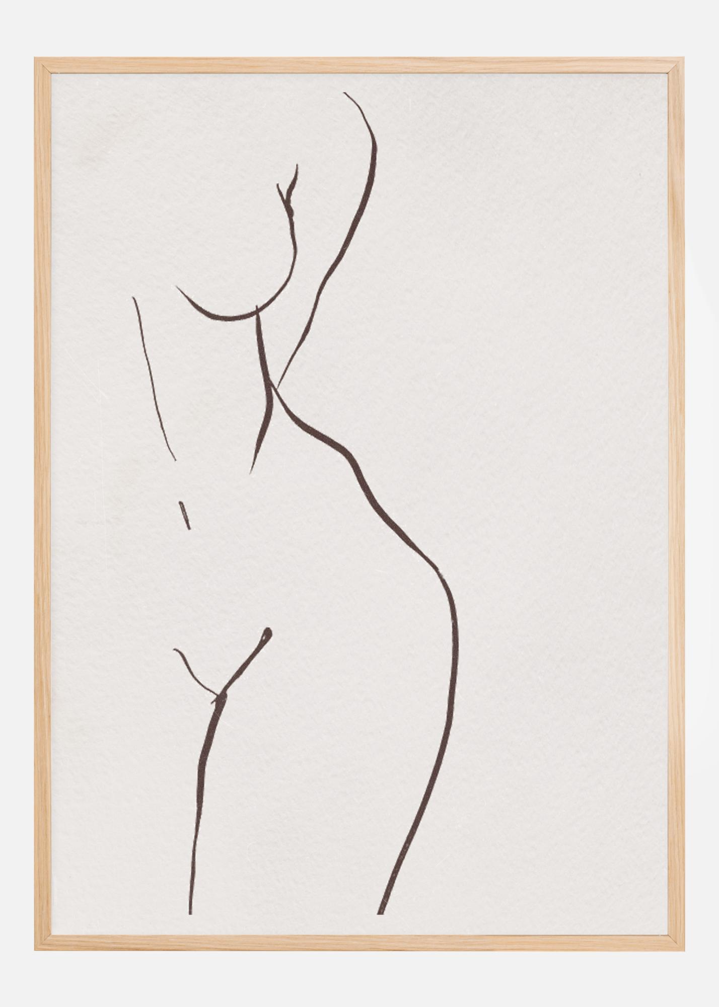 Plakat z boki ženske. Močno izražene črne črte na beli podlagi skicirajo stran ženske od boka do rame. Mehke krivulje vodijo pogled okoli njenih oblik v tej tekoči sliki. Obesite to na svojo steno za umetniški občutek.