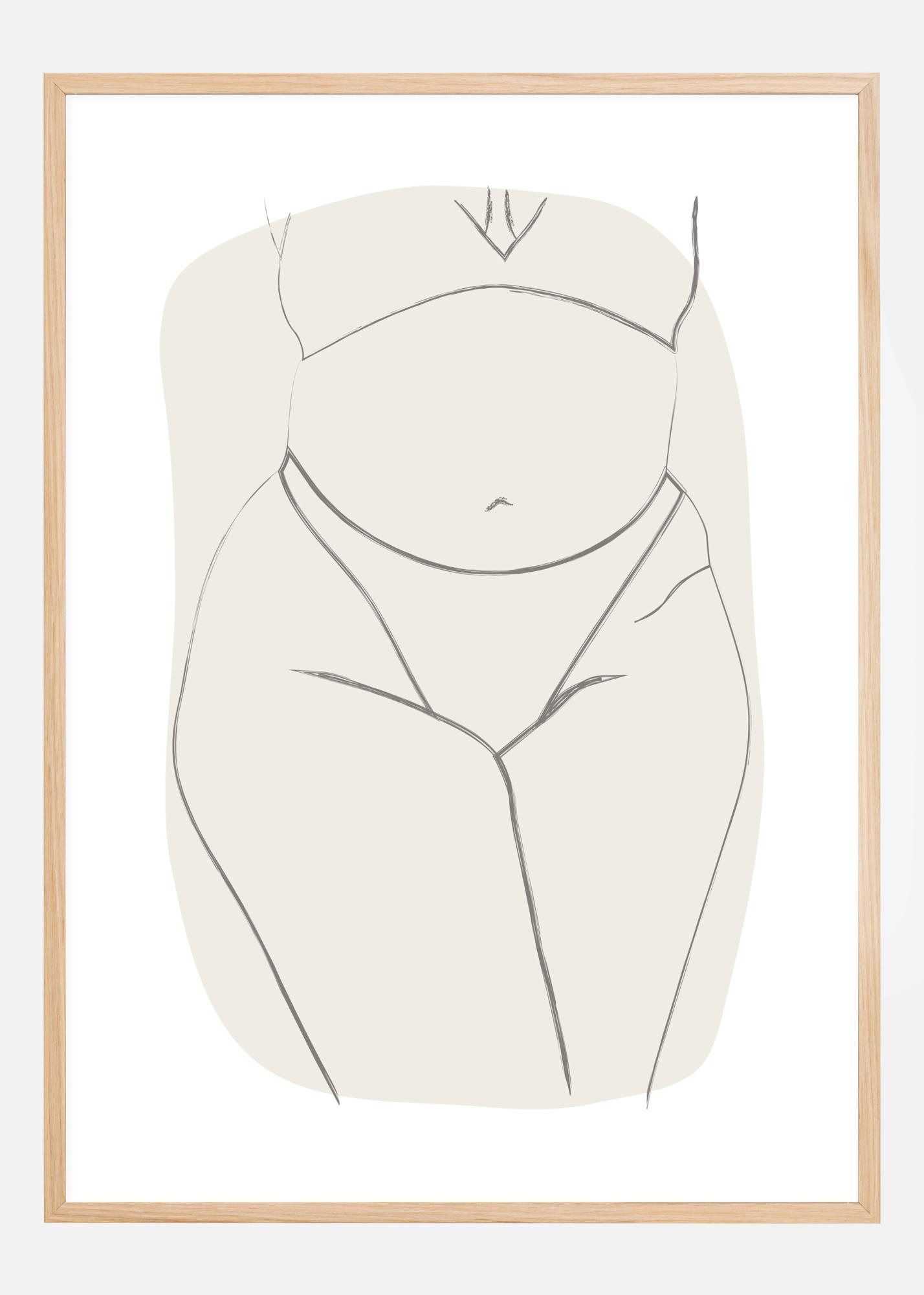 Preprost poster z risbo ženskega trebuha in nog. Linije sramežljivo prikazujejo ženske prekrižane noge, ko nosi preprost bikini. Označeno s svetlo sivo barvo, močne linije izstopajo in ustvarjajo umetniško delo. Združite sliko z barvno steno za najboljši učinek.