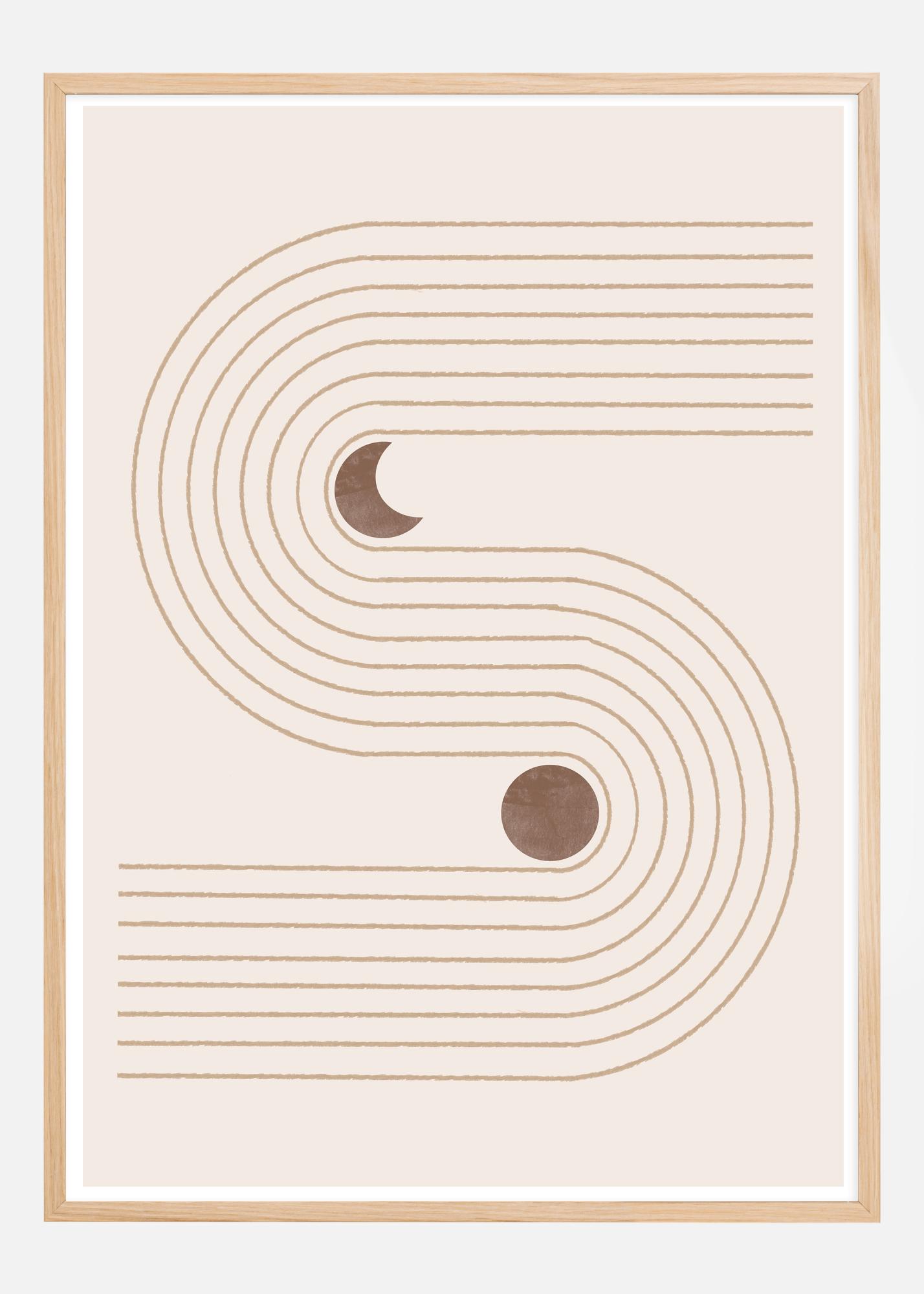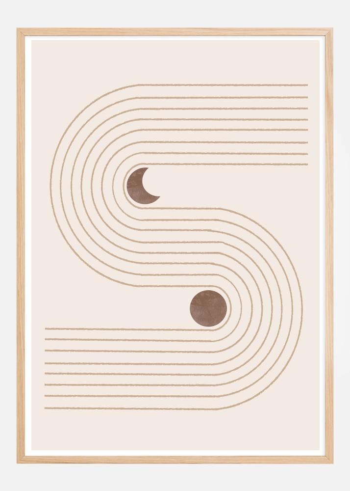 Ta plakat ponuja minimalistično interpretacijo boemskih oblik in nebesnih teles s svojimi valovitimi loki in črtami, ki oblikujejo harmoničen vzorec. Ima pomirjujočo paleto zemeljskih odtenkov, z dodatki temno rjavih krogov, ki lahko predstavljajo lune ali planete, kar daje dizajnu kozmičen pridih. Loki dajejo občutek gibanja in toka, medtem ko okrogle oblike prispevajo element ravnotežja in simetrije.