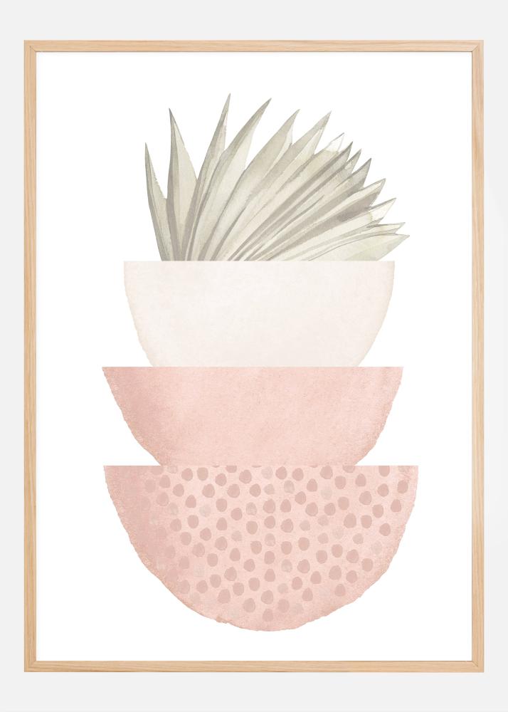 Ta elegantna plakat je poklon minimalističnemu oblikovanju in prečiščeni estetiki. Sivo-zelena rastlina izstopa iz polkrožne sklede v rožnatih tonih z nežno pikčasto teksturo, vse to na nevtralni podlagi. Kontrast med strogostjo rastline in mehkobo sklede ustvarja prijetno ravnovesje. Ta umetniški tisk je popoln za ustvarjanje sproščenega in organsko občutka v prostoru in se odlično poda v moderen, skandinavski ali boemski notranji stil.