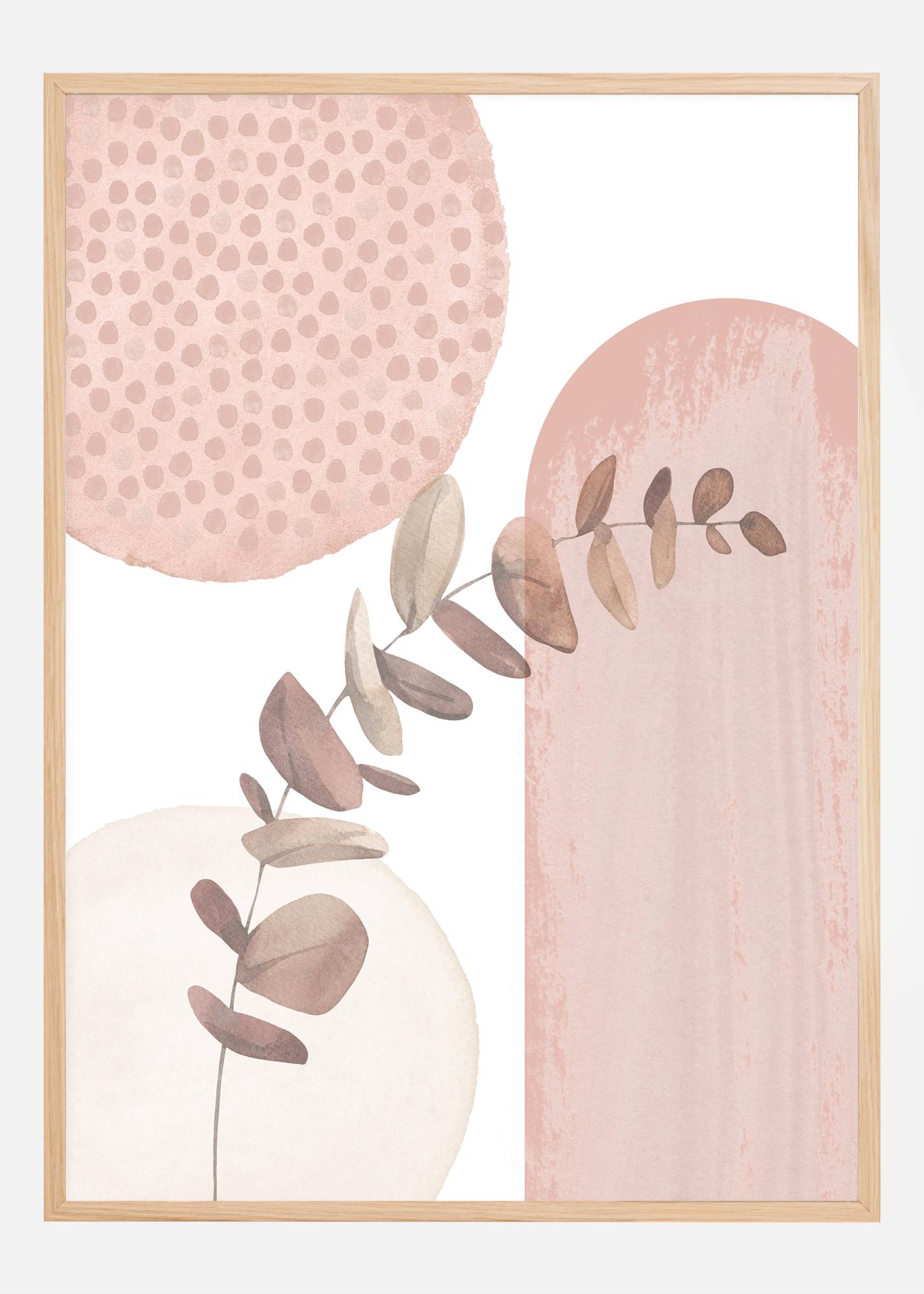 Ta mirna in elegantna poster prikazuje sofisticirano in minimalistično cvetlično ilustracijo v prijetni paleti rožnatih in nevtralnih tonov. Motiv, ki se zdi, da teče čez več abstraktnih oblik, je hkrati sodoben in brezčasen. Preprosta veja z elegantnimi listi se razteza čez kompozicijo, medtem ko ozadje s krožnimi vzorci in mehkimi barvami ustvarja občutek prostora in globine. Ta umetniški tisk je odlična notranja podrobnost za vse, ki cenijo mirne barve in subtilen dizajn v svojem domu.