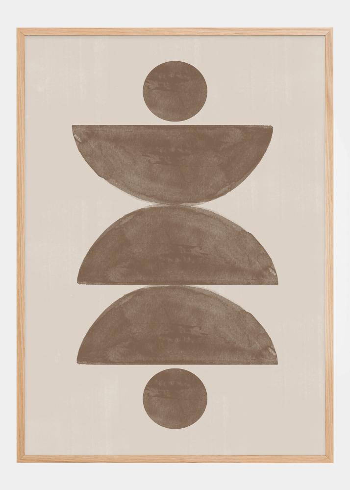 Ta pomirjujoča in estetsko zadovoljujoča plakat prikazuje harmonično zlaganje mehkih geometrijskih oblik. Dva polmeseca v zemeljsko rjavi barvi sta uravnotežena z dvema popolnoma okroglima krogoma, simetrično postavljenima nad in pod. Ta minimalistična kompozicija ponuja občutek miru in je popolna predstavitev boemske stila z mehkim in sodobnim pridihom.