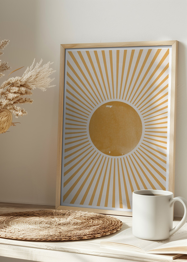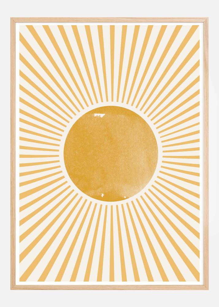Ta živahen plakat vzbuja občutek sijajnega sonca s svojimi izžarevanimi linijami v zlatih tonih, ki obkrožajo osrednji rumen krog na mehkem belem ozadju. Dizajn je navdihnjen s bohemskimi in geometrijskimi vzorci, ki skupaj ustvarjajo podobo topline in energije sonca. Topli odtenki in sijajni vzorec so zasnovani tako, da dajejo občutek veselja in pozitivnosti.