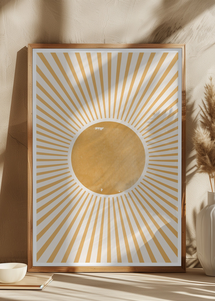 Ta živahen plakat vzbuja občutek sijajnega sonca s svojimi izžarevanimi linijami v zlatih tonih, ki obdajajo osrednji rumeni krog na mehkem belem ozadju. Oblika je navdihnjena z bohemskimi in geometrijskimi vzorci, ki skupaj ustvarjajo podobo toplote in energije sonca. Tople barve in sijoč vzorec so oblikovani tako, da dajejo občutek veselja in pozitivnosti.