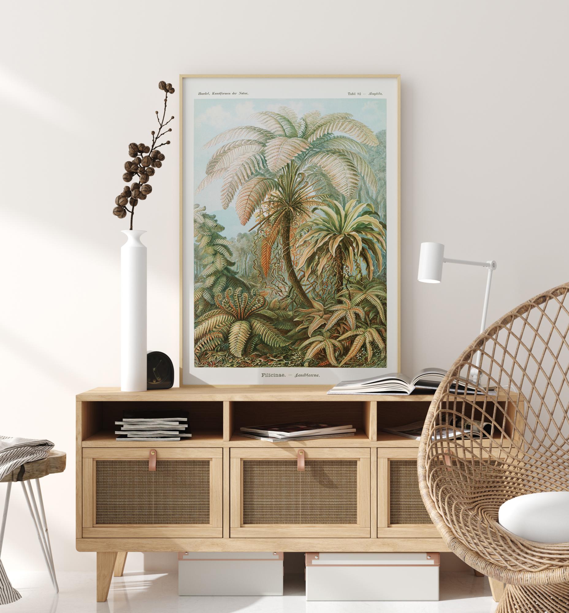 Ilustriran botanični plakat z različnimi rastlinami. Veliki palmovi listi in praproti pokrivajo celotno to sliko. Zelena, modra in oranžna ustvarjajo mehke tone v tej starodavni nemški znanstveni risbi. Dajte svoji hiši pridih zgodovine s pomočjo teh rastlin in njihovih latinskih imen.