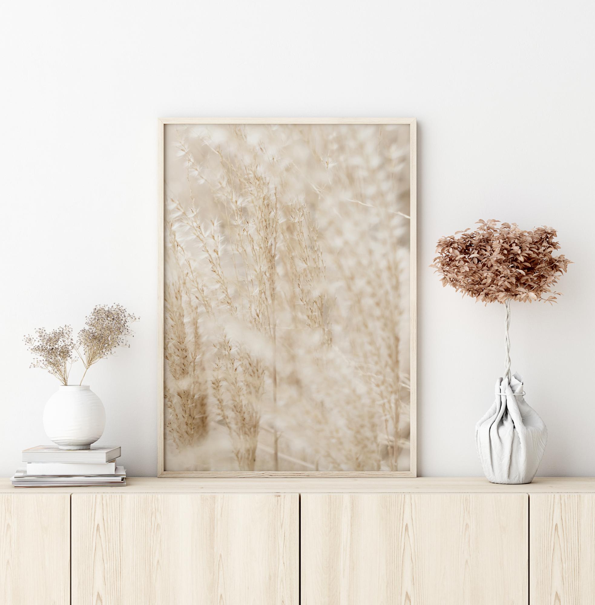 Mehko zlata barvni plakat s poljem. Slika je sproščujoča, z nežno izostrenimi klasi pšenice, katerih mehki konci so osvetljeni skoraj angelim belim sijajem. Za nekoliko pomirjujoč eterični pogled, je to popolno delo za obešanje na eno od kontrastnih sten doma.