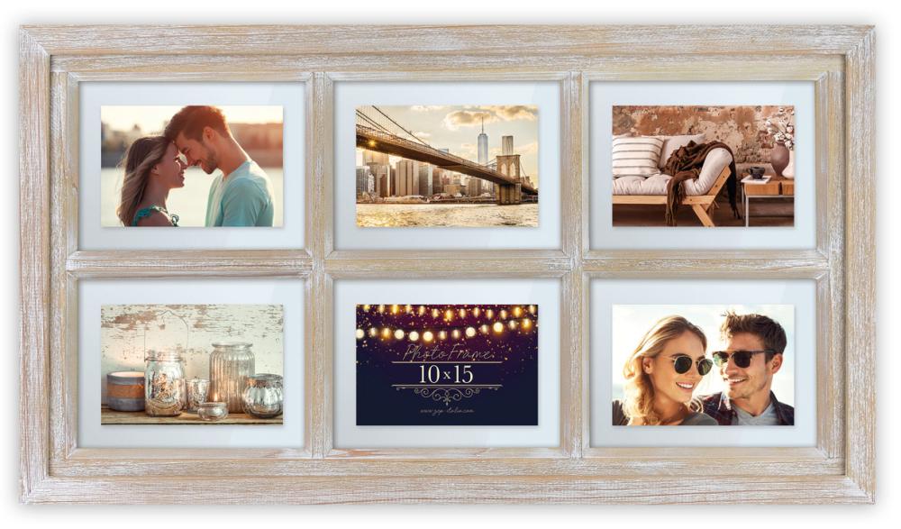 Ležeči kolažni okvir v svetlem lesu. To je okvir, ki omogoča shranjevanje 6 fotografij v velikosti slike 10x15 cm in vam omogoča enostavno razporejanje skupine slik skupaj na lep način. Okvir ima nekaj lesenih vzorcev, ki mu dajejo rustikalen, ampak hkrati podeželski značaj. Zunanji mere okvirja so 38,5x69,5 cm. Stenski nosilec je na voljo.