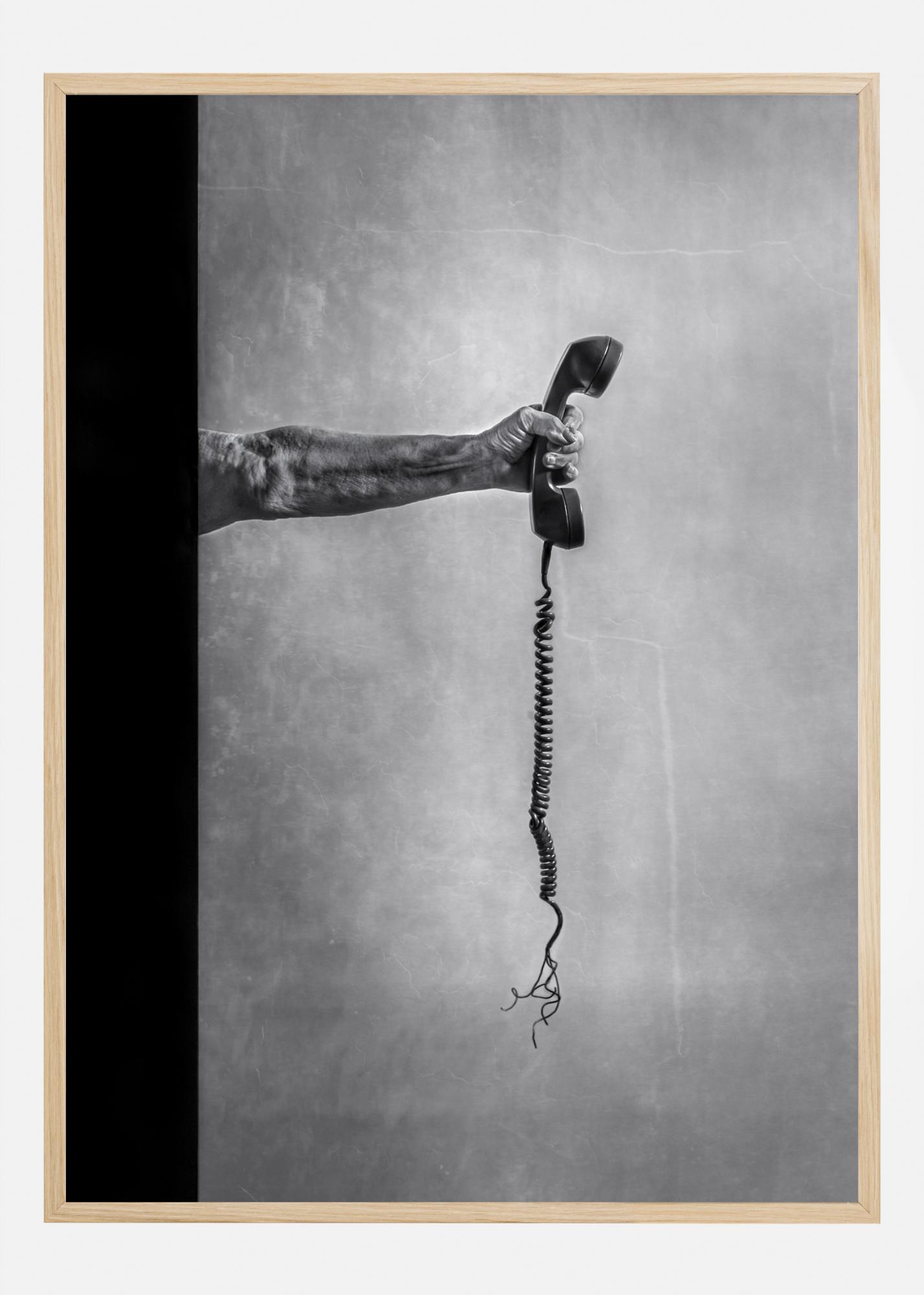 Črno-beli plakat z roko, ki drži telefonsko slušalko z odrezano vrvico. Močna roka drži telefon na sredini slike. Črn telefon in vrvica visita proti sivi podlagi. Kdo je tisti, ki mu je telefon namenjen? Sprostite se in uživajte v tej sliki, medtem ko visi v vašem domu.