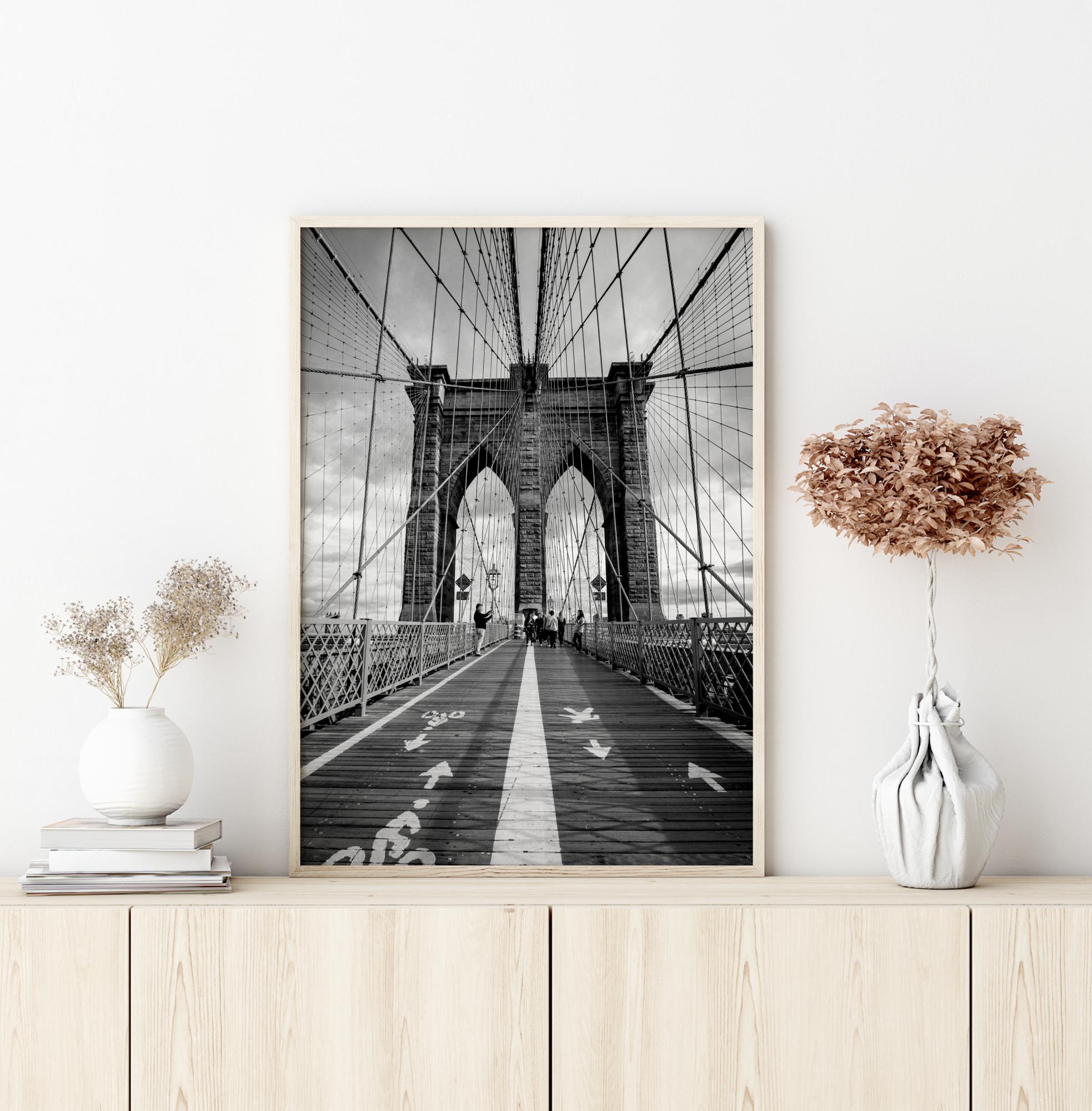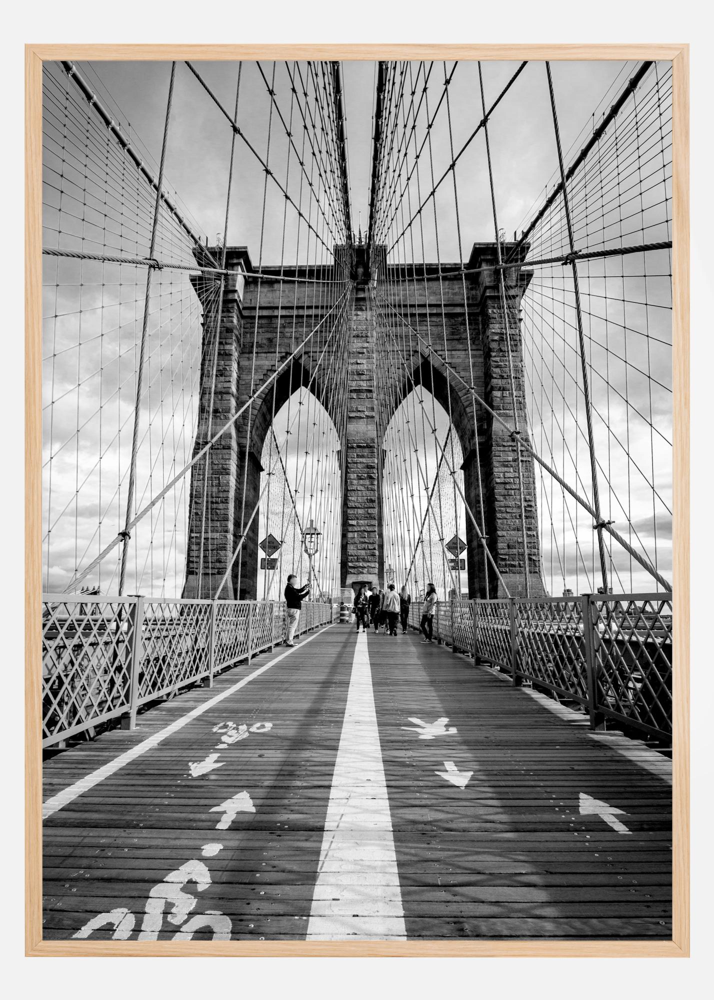 Črno-bela fotografija pešpoti Brooklynske brvi, mogočnih stolpov in zanimive viseče naprave v obliki jeklenih žic v velikih mrežah. Plakat, ki se odlično poda v kombinaciji z drugimi favoriti v večji kolažni postavitvi.