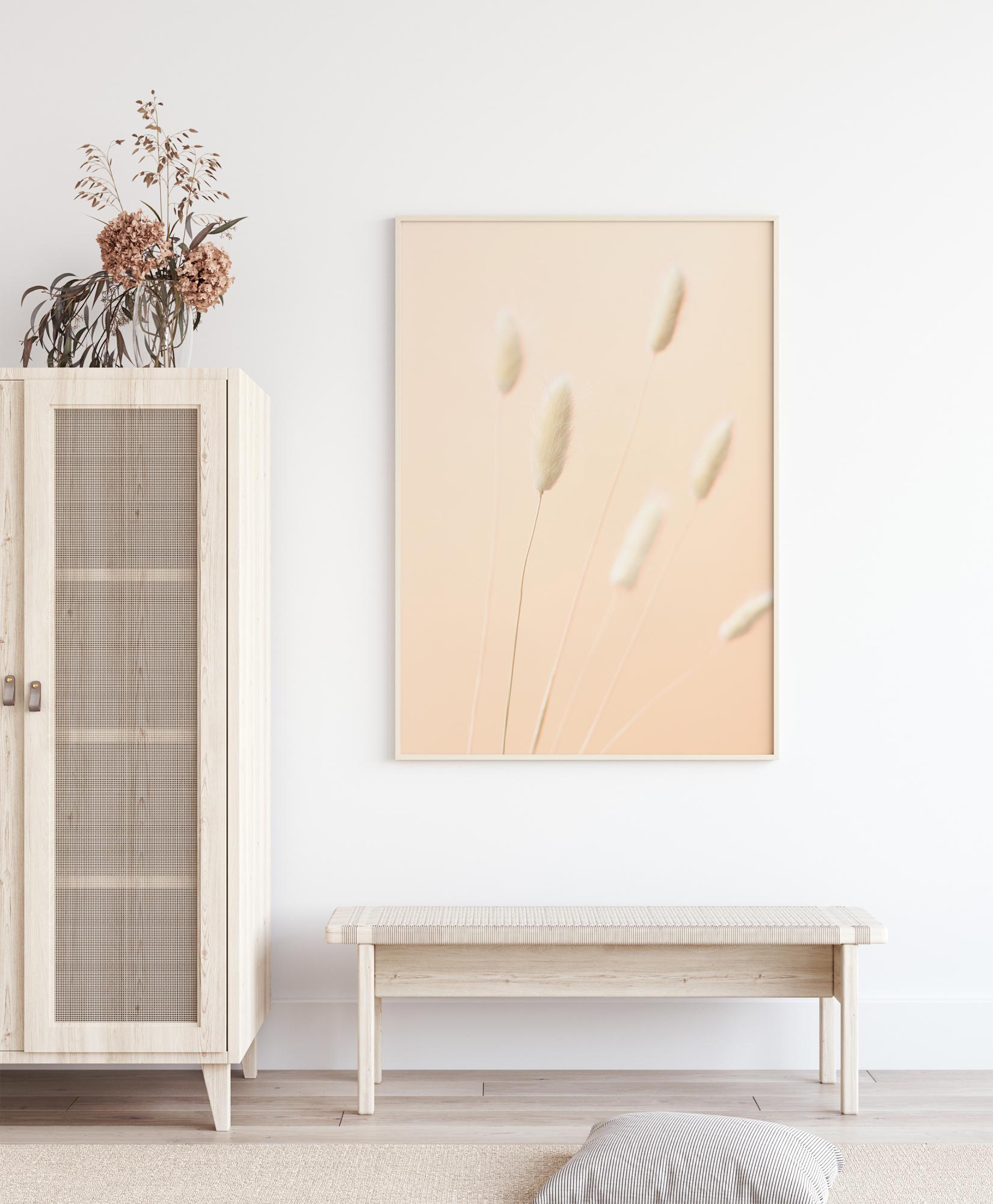 Preprost plakat z rožami z nekaj zajčjega repa v vrču. Lahka zračna stebla skoraj slikajo steno za njimi. Te subtilne pastelne barve delujejo popolno skupaj z drugimi barvami ali celo popolnoma belo steno.