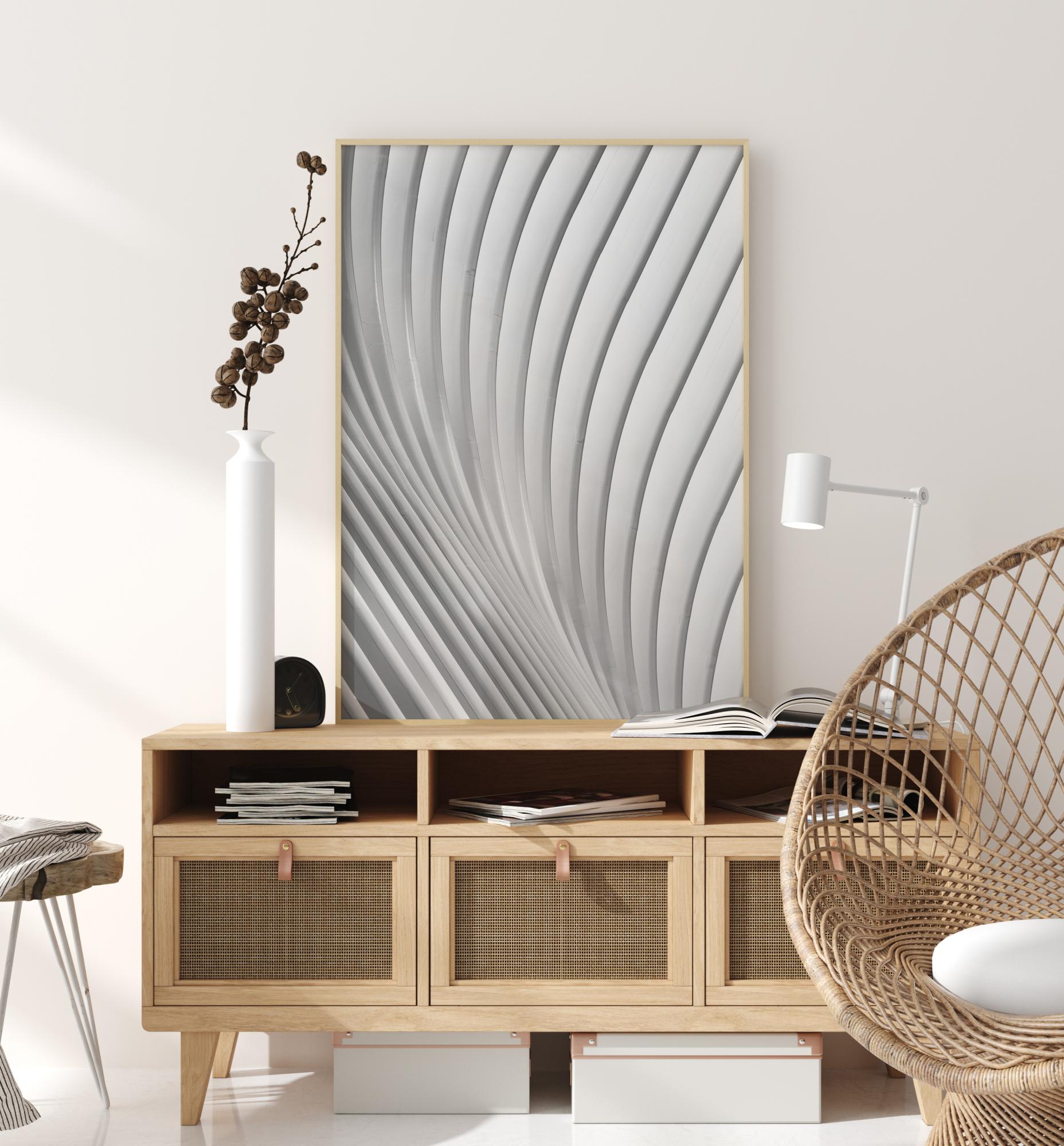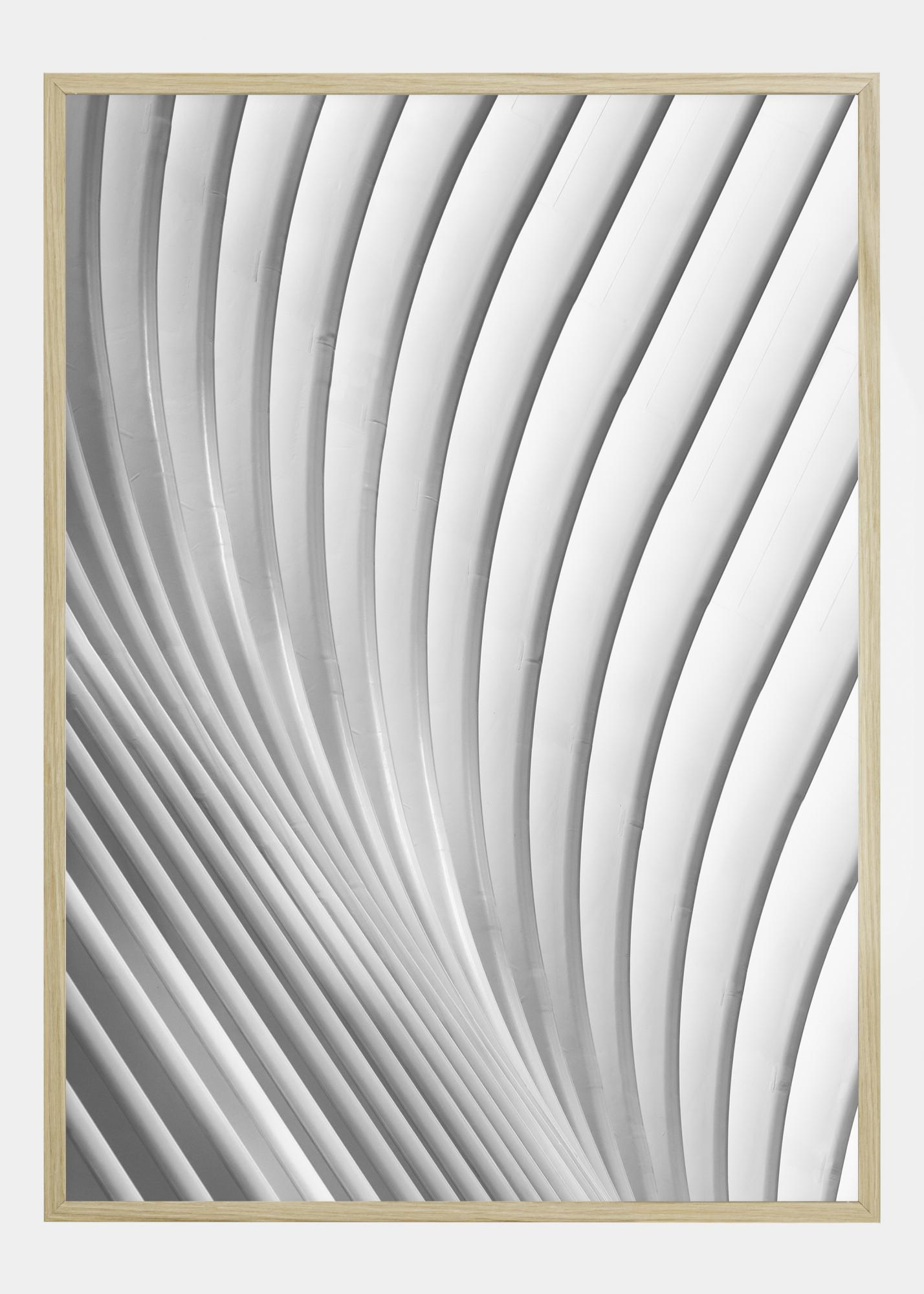 Abstraktni plakat z valovitimi belimi in sivimi črtami po celotni podobi. Črte se začnejo spodaj desno in se nežno upognejo navzgor, preden zavijejo v desno. Čeprav je preprosta, ta slika pritegne pozornost, ko pustite svojim očem, da se sprostijo in sledijo črtam.