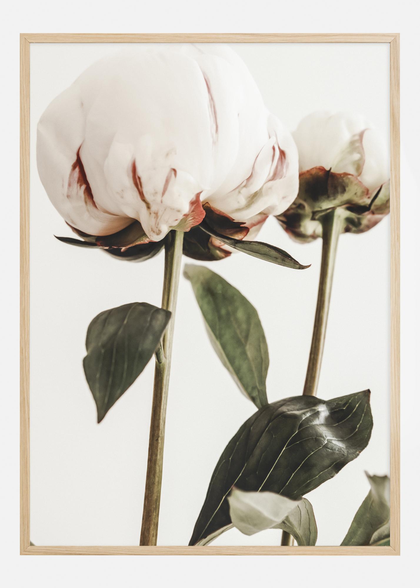 Ta plakat ujame izjemno lepoto potonik v polnem razcvetu. Veliki, puhasti cvetovi, s svojimi nežno prepognjenimi cvetnimi listi v odtenkih bele in rdeče-rjave, ponosno stojijo na svojih močnih steblih. Temno zeleni listi tvorijo močno ozadje, ki poudarja občutljivo strukturo cvetov in bogate barvne tone.