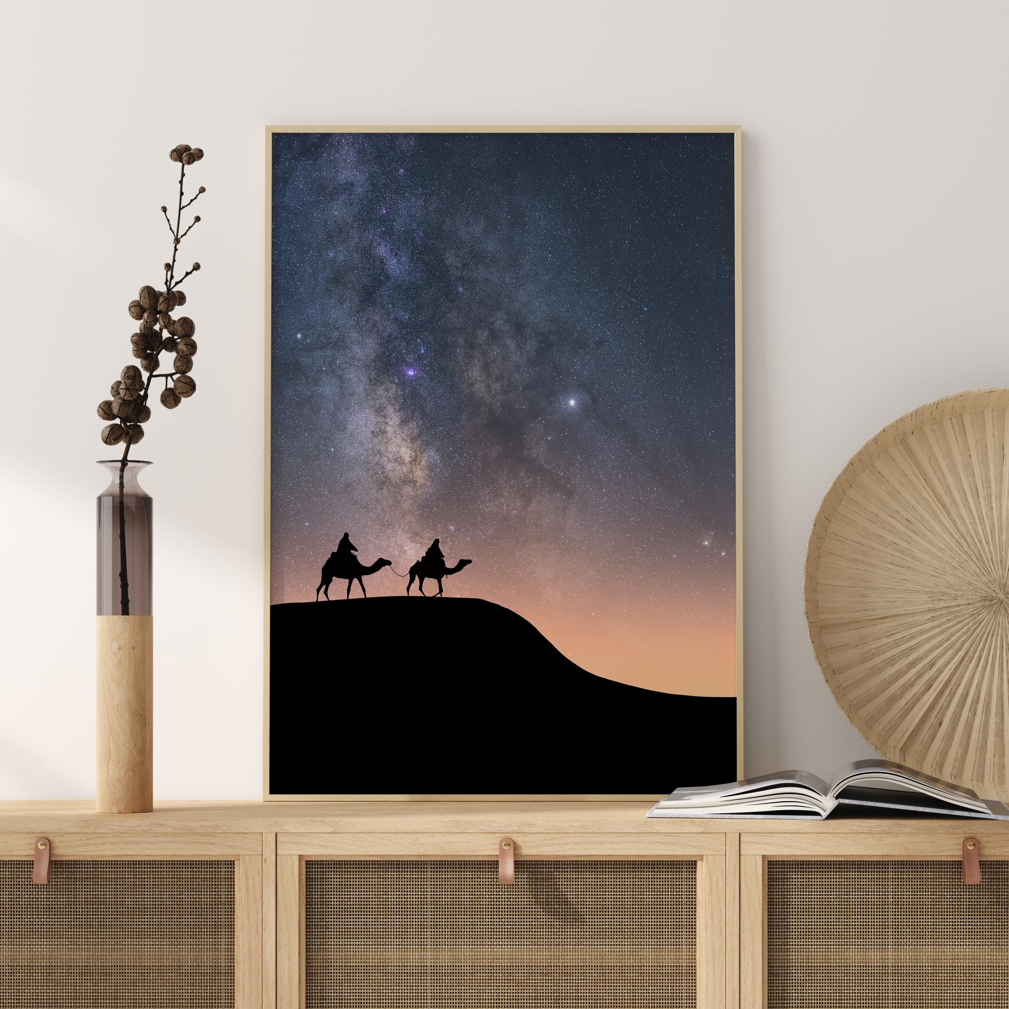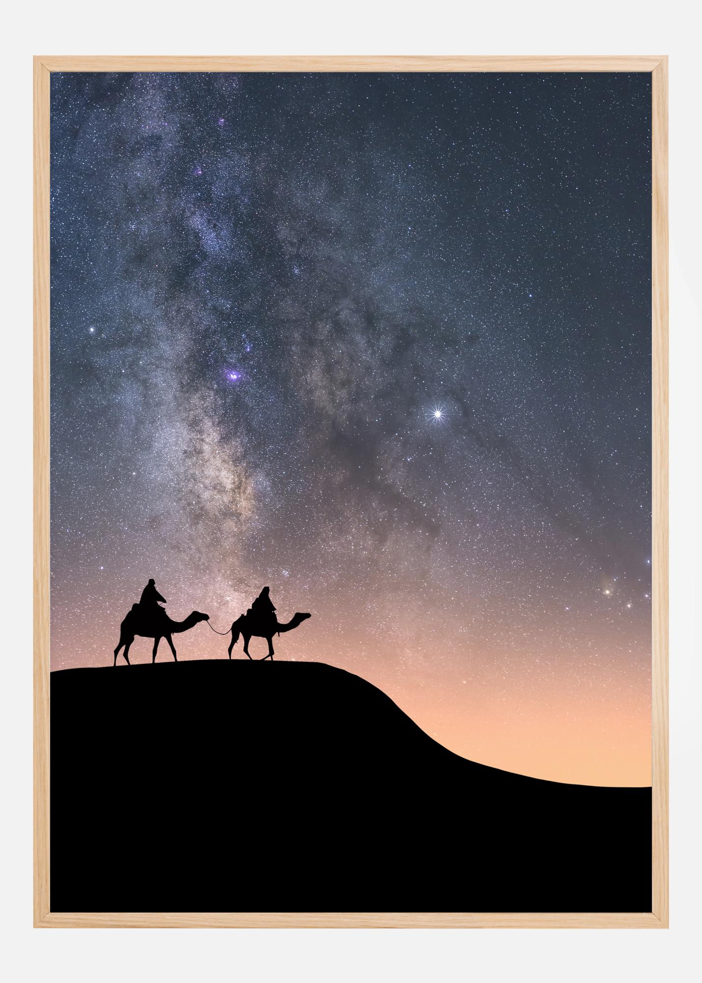 Dramatičen poster z dvema kamelama pod zvezdnatim nebom. Mlečna cesta sveti svetlo, medtem ko sta dve kameli s svojimi jahači v silhueti pod zvezdami na tej epski fotografiji. Mehko oranžen sončni zahod dodaja skrivnostnost tej sceni. Odpravite se na oddaljen kraj, ko obesite ta magični prizor v svojem domu.