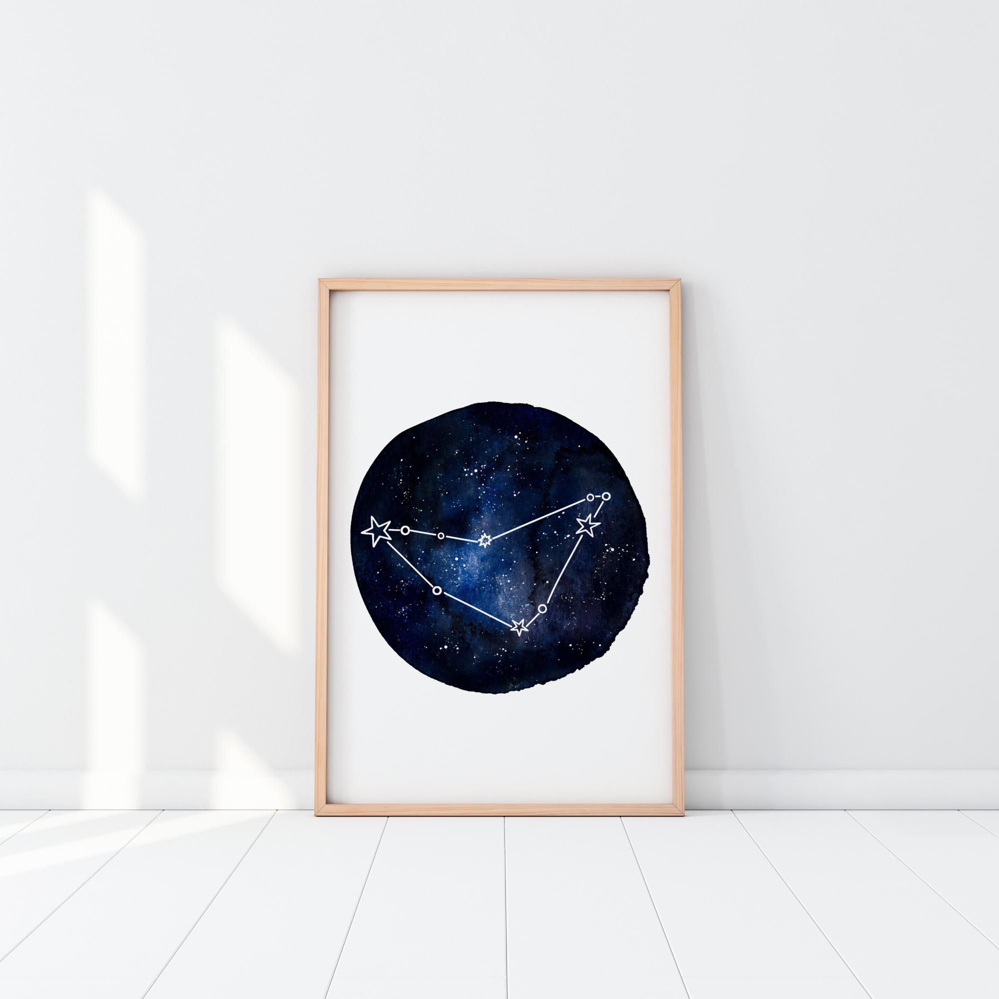 Plakat horoskopa z znakom Kozoroga. Temno moder krog zapolni sredino bele podlage. V krogu je več različnih modrih odtenkov, pa tudi zvezdice. Glavno ozvezdje je znak Kozoroga. Obešeno naj bo, če vam je všeč vaše zvezdno znamenje.