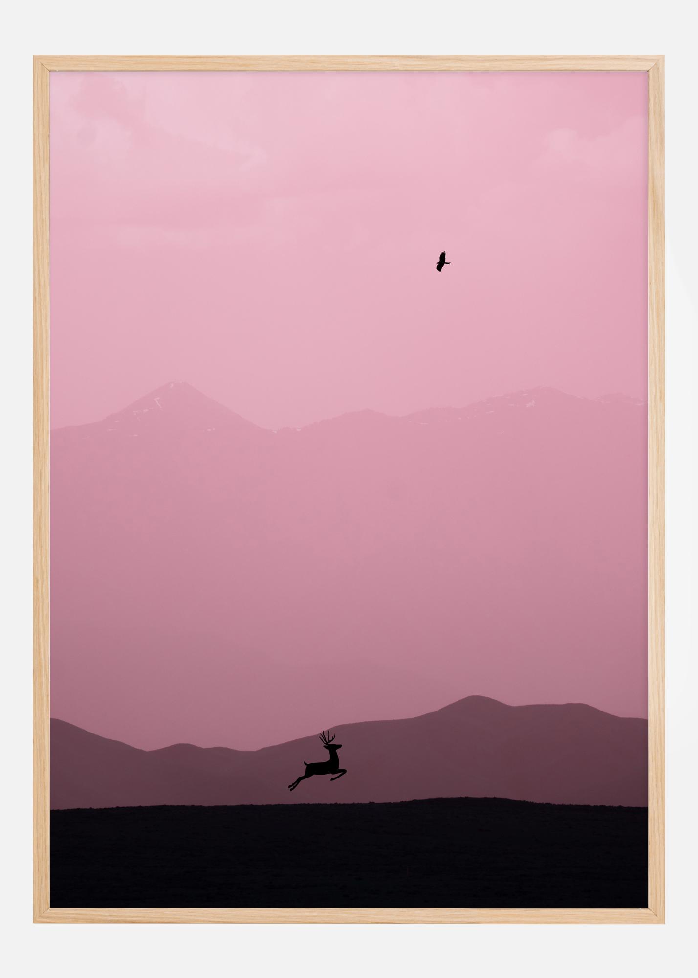 Ta mirna in sanjska plakat zajame bistvo svobode in lepote narave. Silhueta jelena, ujetega med skokom nad silhueto mehko valovitih gričev, daje občutek gibanja in lahkotnosti. Nad vsem se razteza mehko rožnato nebo, ki dodaja občutek topline in čudenja. Osamljena ptica leti proti neskončnosti neba, kar podobi dodaja dodatno dimenzijo svobode in neomejenosti.
