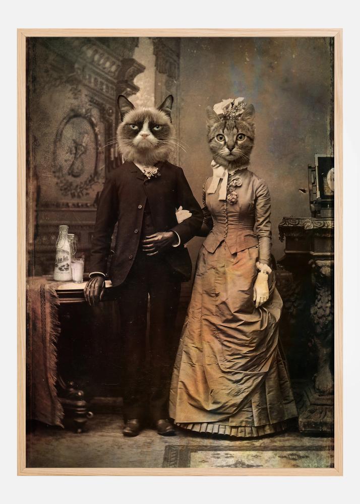 Komičen plakat, ki prikazuje par mačk v viktorijanskih oblačilih. Mučkast maček in njegova nevesta stojita v popolni viktorijanski modi, vključno s kostumom in korzetom, na tej sepijski sliki. Vnesite nekaj smeha v vaš dom s to sliko na vaši dnevni zidni steni.