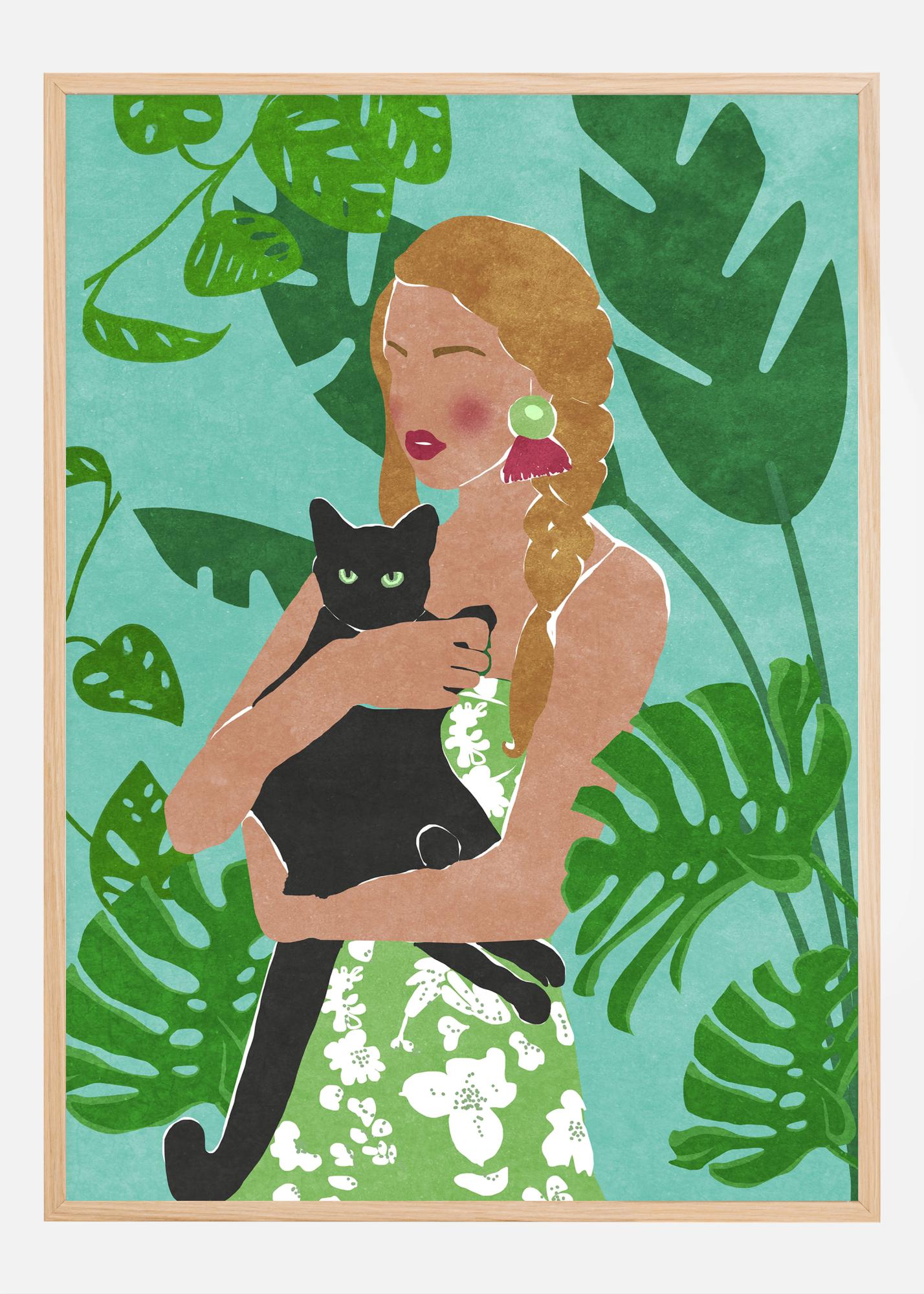 Na plakatu prevladujejo mirni in zemeljski toni. Zelene odtenke rastlin in ozadja ponujajo pomirjujoč kontrast proti bež in rjavim tonom ženske ter globoki črni barvi mačke. Detajli bele obleke z motivom cvetja dodajajo kompoziciji lahkotnost. Plakat je obdan z lesenim okvirjem (ni vključen v motiv), ki še dodatno poudari naravni občutek. To je tisk, ki ni le lep dekorativni element, ampak tudi izraz prijaznosti do živali in poklon preprostim radostim življenja.