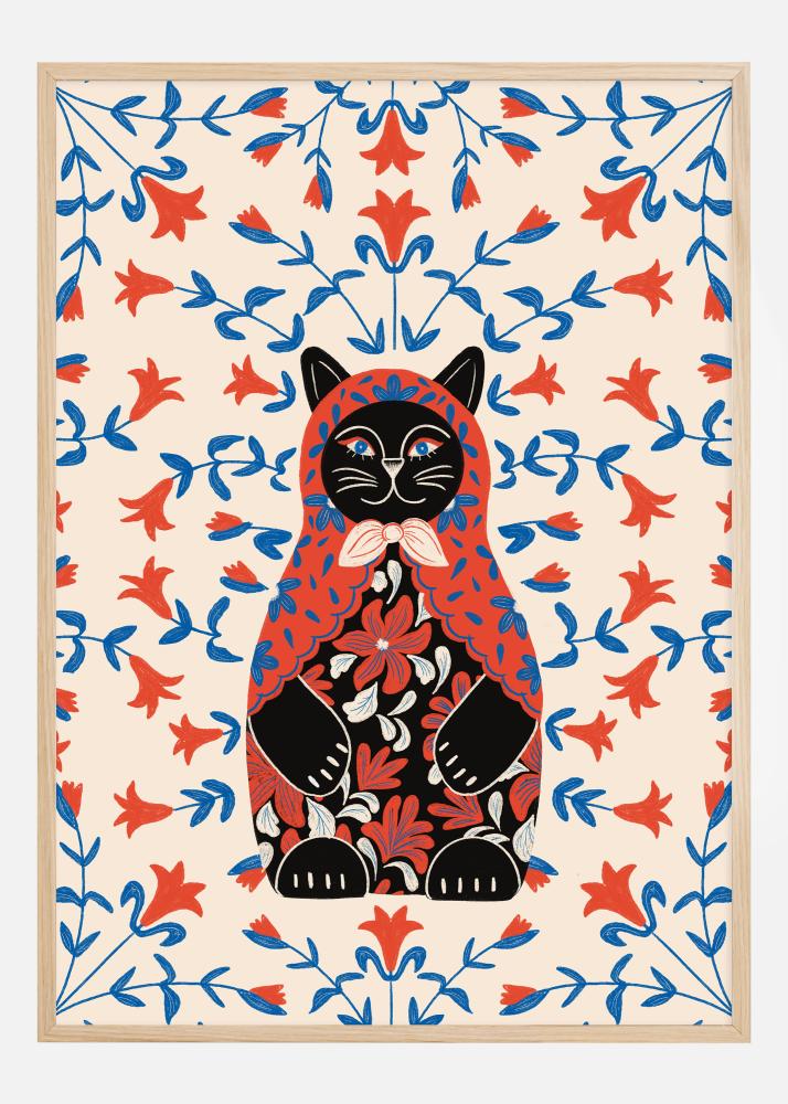 Ta živahen in barvit plakat je sodobna interpretacija klasične ruske matrijoške, ponovno predstavljene kot veličastna mačja figura, ki sedi v središču, obdana z bujnim cvetličnim vrtom. Mačji pogled je prodoren in skrivnosten, medtem ko je njeno krzno bogato okrašeno z zapletenimi cvetličnimi vzorci. Okoli mačke se razprostira morje rdečih in modrih cvetov na kremni podlagi, kar ustvarja skoraj hipnotični vzorec, ki je hkrati očarljiv in lep.