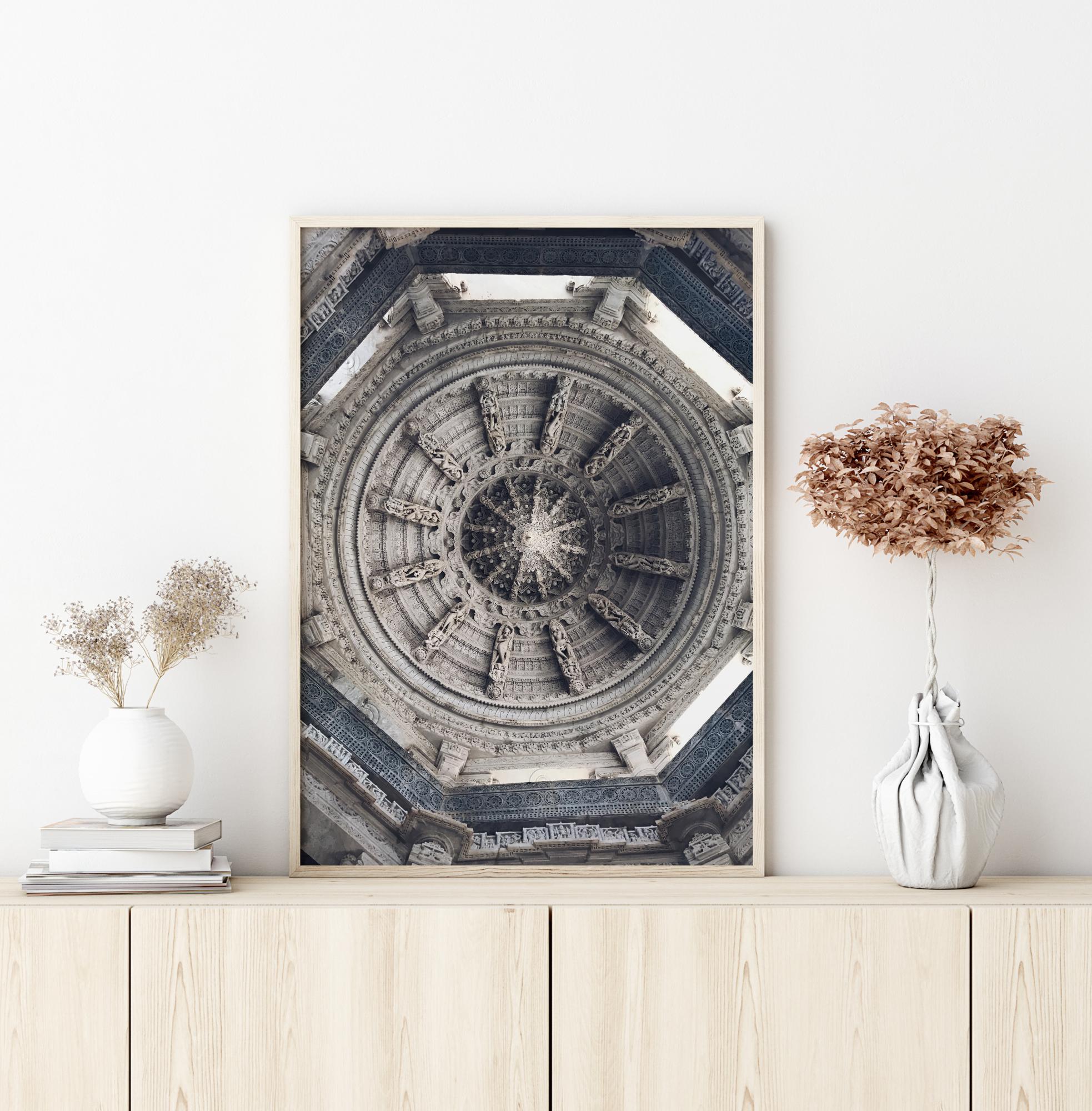 Črno-beli poster s sivo streho. Streha je oblikovana s krogi in izgleda kot ladijsko kolo. Obkrožena z osemskotnikom ima povsod geomterijske oblike. Dodajte malo življenja nežno modri steni, tako da obesite ta poster s streho.