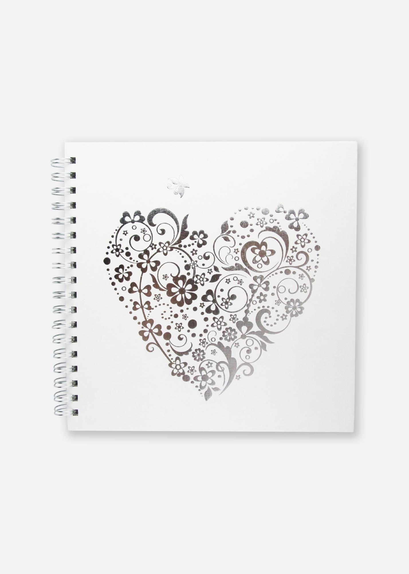 Ljubek, spiralno vezan album v beli barvi velikosti 25x25 cm. Na sprednji strani je natisnjeno srebrno srce z lepimi cvetličnimi detajli. Album vsebuje 24 listov brez kislin v beli barvi in je popoln album, ki ga lahko pustite na vidnem mestu za listanje, ne da bi zavzemal preveč prostora.