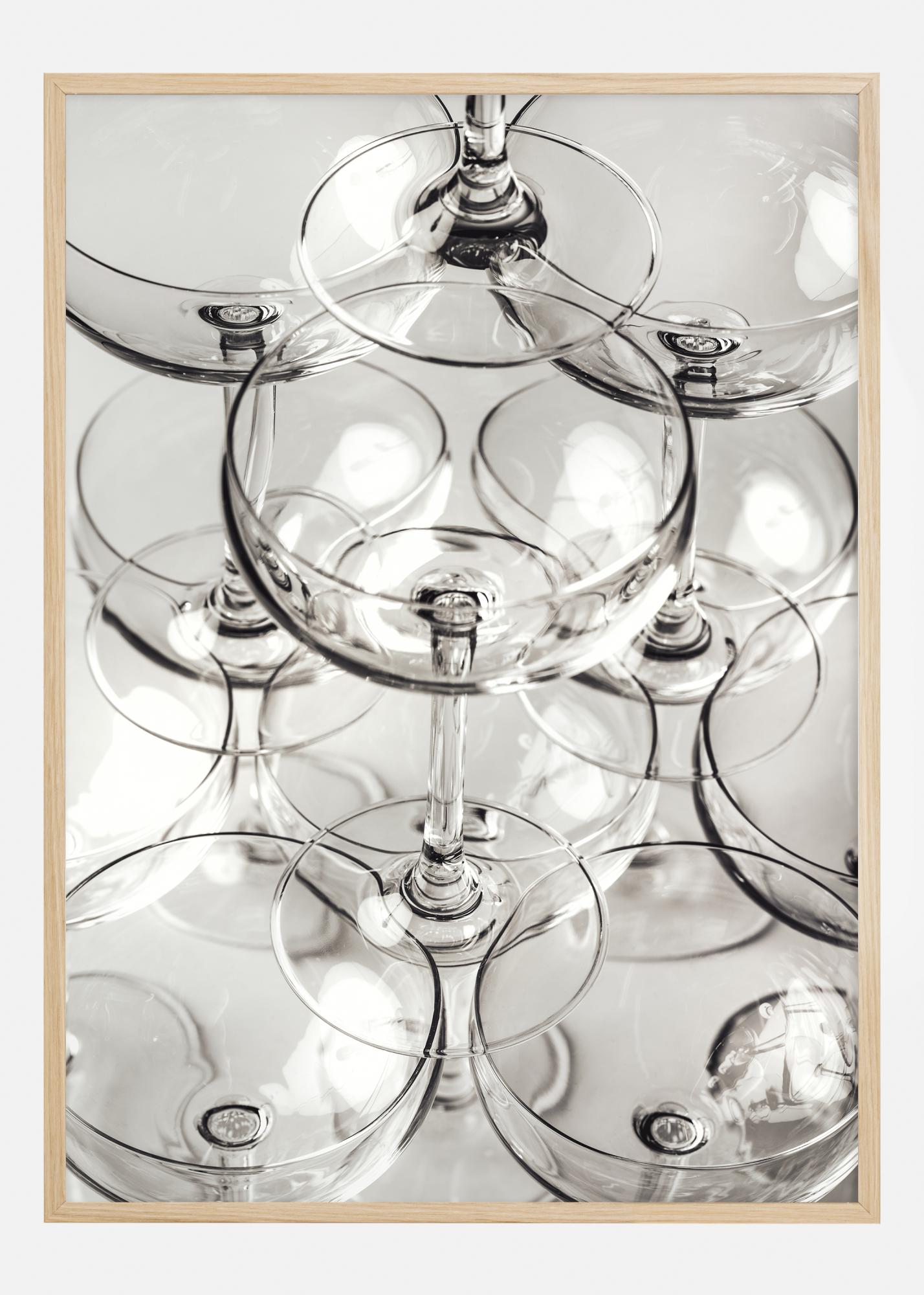 Ta eleganten in prefinjen plakat zajame lepoto in jasnost kaskade šampanjskih kup. Slika prikazuje bližnji posnetek zapletene strukture stekla, kjer se svetloba odseva in lomi skozi prosojni material ter ustvarja ples svetlobe in senc. Bogastvo podrobnosti in nežna natančnost v kompoziciji poudarjata občutljive oblike kozarcev in subtilne odtenke v steklu.