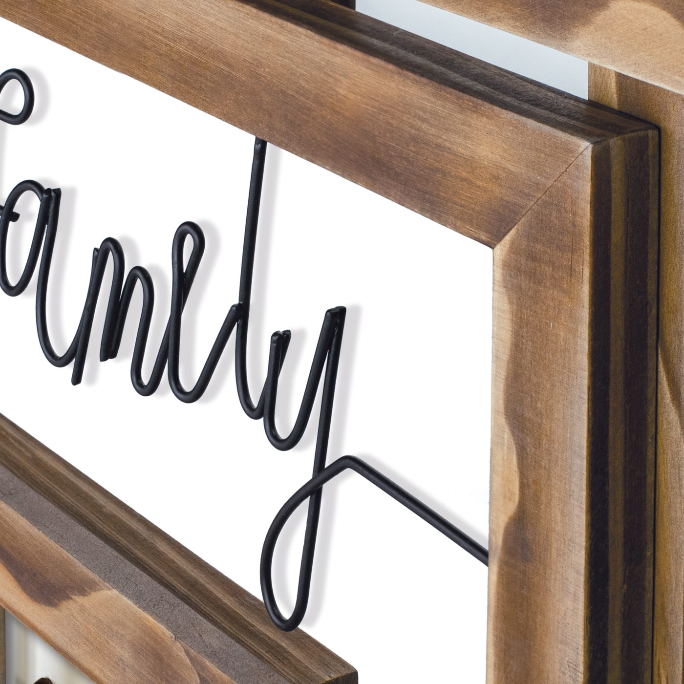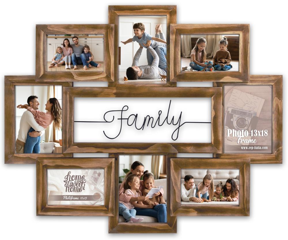 Ta lep kolažni okvir je kot nalašč za oživljanje vaših najboljših spominov z družino in uokvirjanje! Kolažni okvir je v toplem odtenku lesa v rjavi barvi, v sredini med okvirji pa stoji beseda "družina" v črnih črkah. Okvir sprejme 8 slik v velikosti 10x15 cm in 13x18 cm. Na voljo je tudi stenski nosilec.