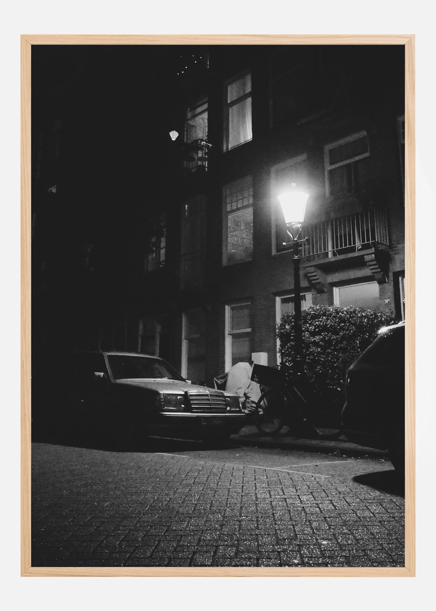 Ta očarljiv plakat ponuja vpogled v mestno življenje, ko se spušča noč. Osamljena ulična svetilka obkroža pločnik in parkirane avtomobile v mehki, topli svetlobi. Motiv je ujet v monokromatski paleti, ki poudarja kontraste in podrobnosti te mirne mestne podobe. Ta tisk je idealen za vnašanje občutka umirjenosti in razmisleka v kateri koli prostor ter spominja na mirne trenutke v sicer pulzirajočem ritmu mesta.