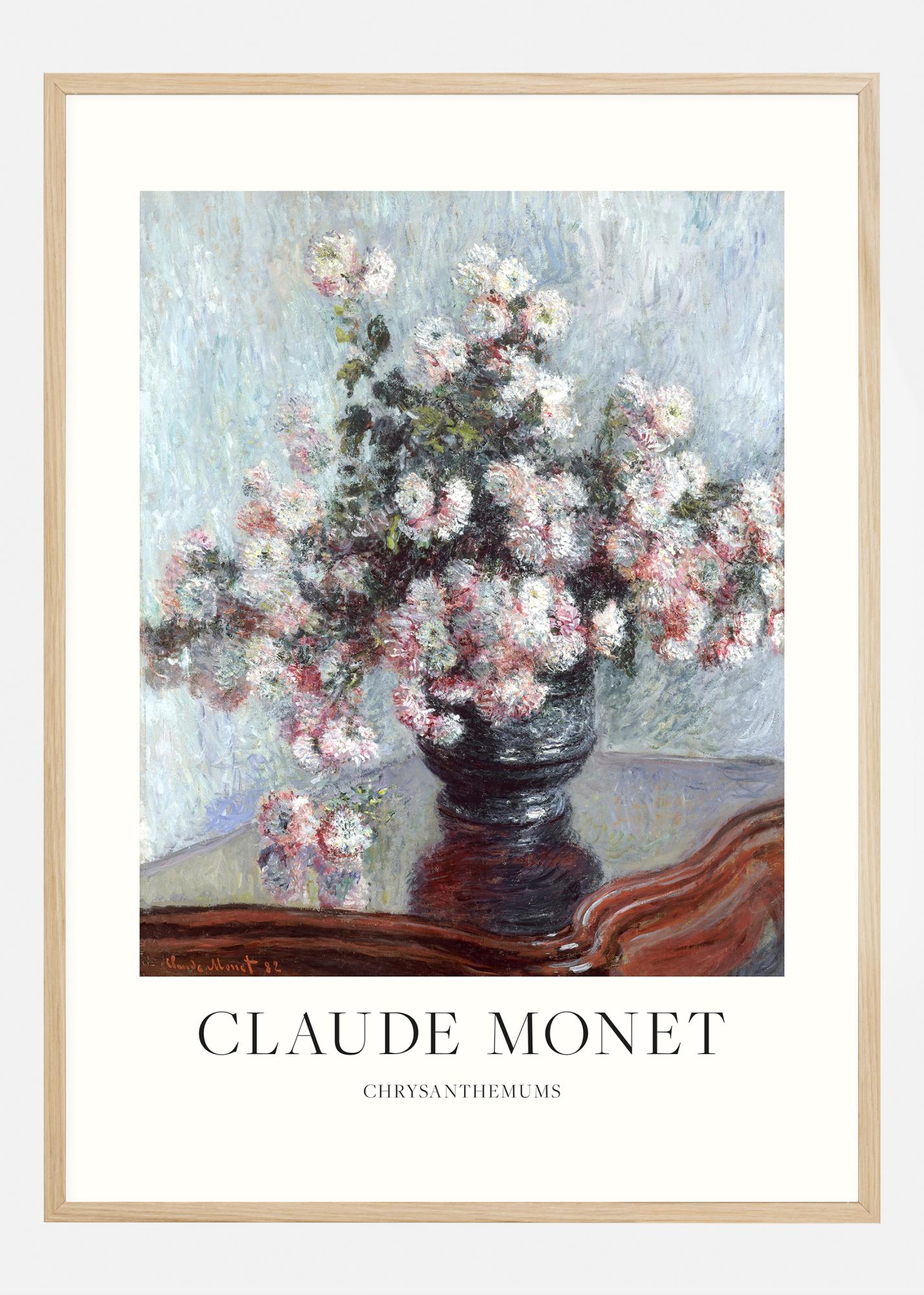 Občudujte globino in teksturo slike 'Krizanteme' Clauda Moneta, ki prikazuje njegovo edinstveno sposobnost zajemanja bistva narave. Ta občutljiva upodobitev krizantem v vazi je del Monetovega širšega dela, ki slavi lepoto cvetja. Slikarija, ki je datirana v leto 1892, prenaša mehkobo cvetov in spreminjajoče se barve z impresionističnimi tehnikami, ki ustvarjajo skoraj sanjsko stanje pri opazovalcu. Barvna paleta je ravnovesje občutljivih roza in belih tonov na čustveni modri podlagi, kar ustvarja občutek miru in lepote.