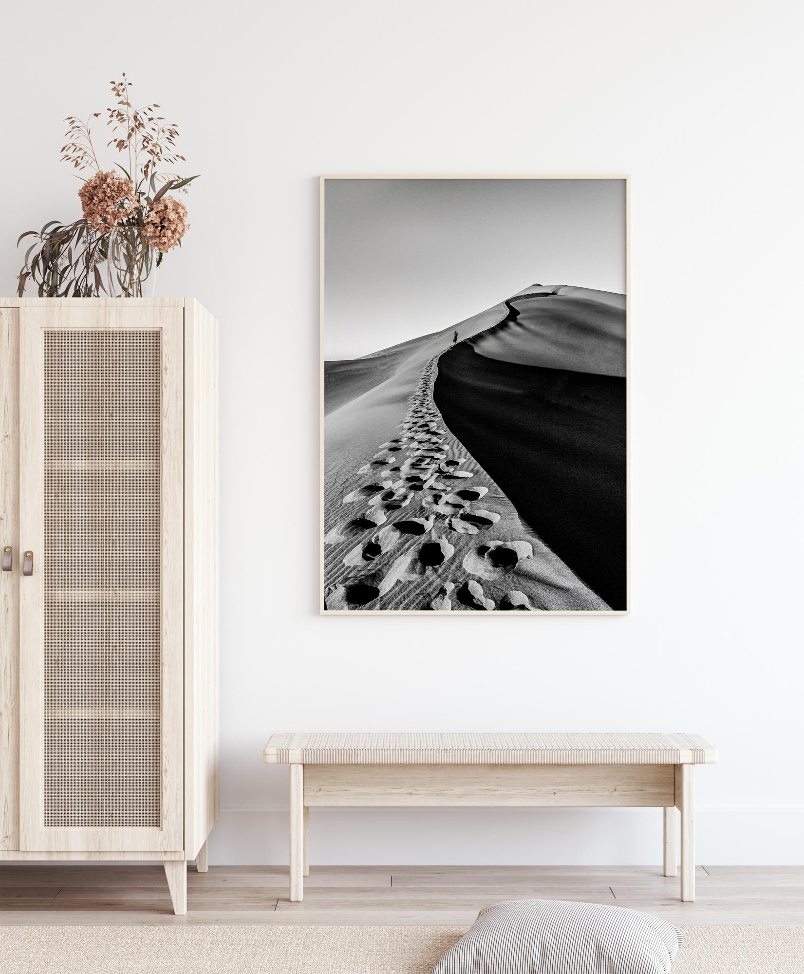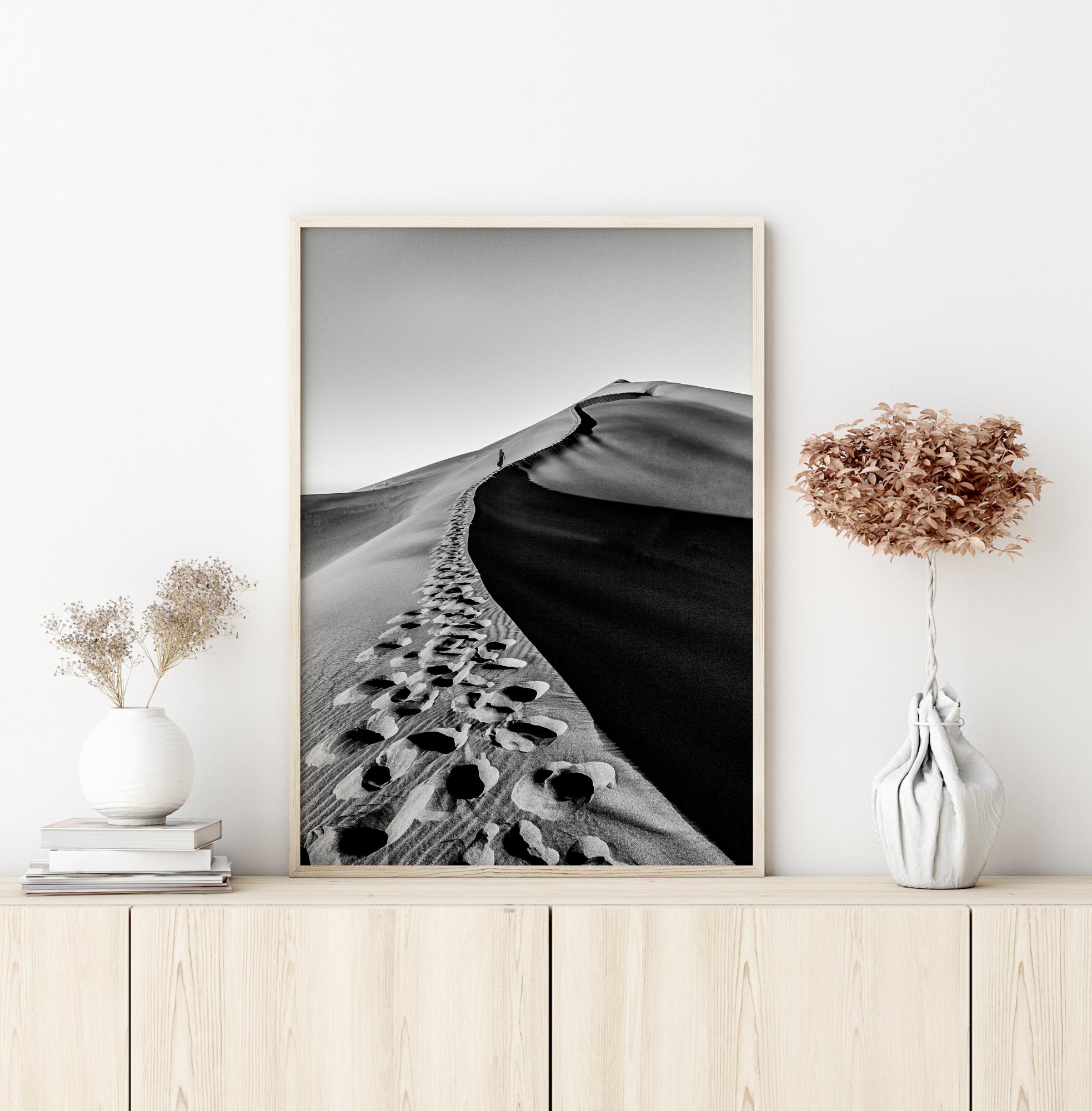 Čudovit plakat osebe, ki pleza na peščeno sipino. Fantastična črna potka kontrastira s sledovi v pesku, kar usmerja pogled proti oddaljeni figuri. Ta slika prinaša občutek avanture v domačo okolje.