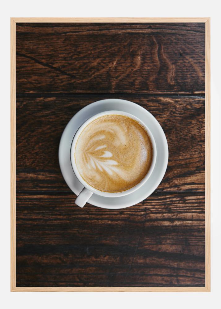 Ta prijeten in topljiv poster je poklon kavi kulturi in popoln za vsakega ljubitelja kave. Pogled od zgoraj na klasično belo skodelico kave na temno rjavi leseni površini daje takojšen občutek udobja in odmora v vsakodnevnem življenju. Peno na kavi krasi lep umetniški vzorec, ki vabi k trenutku sprostitve in užitka.