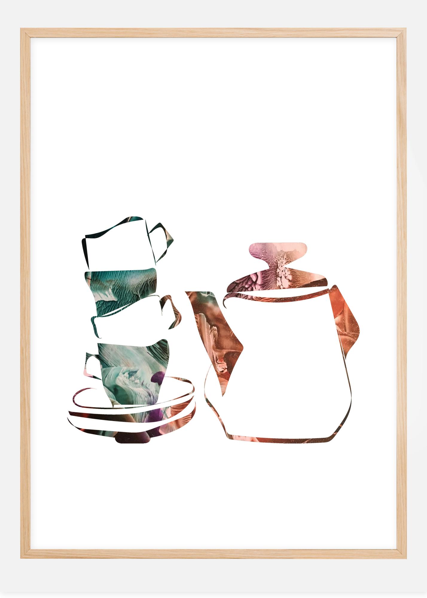 Abstraktni plakat s kavo in čajem ter skodelice, krožniki in vrč. Vsak je narejen iz abstraktnih marmoriranih polj v turkizni in oranžni barvi na beli podlagi. Pripravite se na svojo priljubljeno toplo pijačo, medtem ko vsako jutro gledate to sliko.