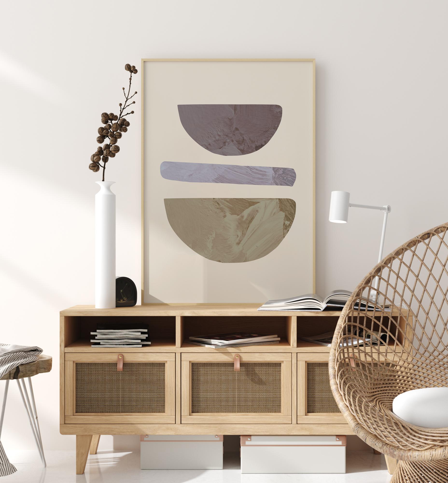 Abstraktni poster s tremi različnimi oblikami barvnih črt. Velika krog v kremni in bež barvi je postavljena na spodnjem robu in nad njo tanka modra črta. Na zgornjem robu je druga polkrog v sivi in modri barvi. Ko obesite to delo v predsobi doma, bo zagotovo tema pogovora.