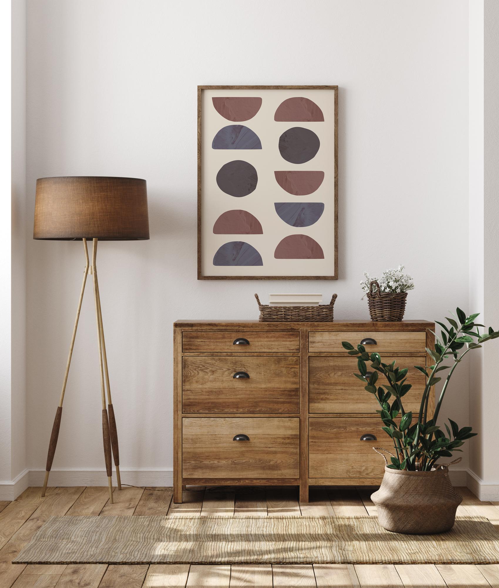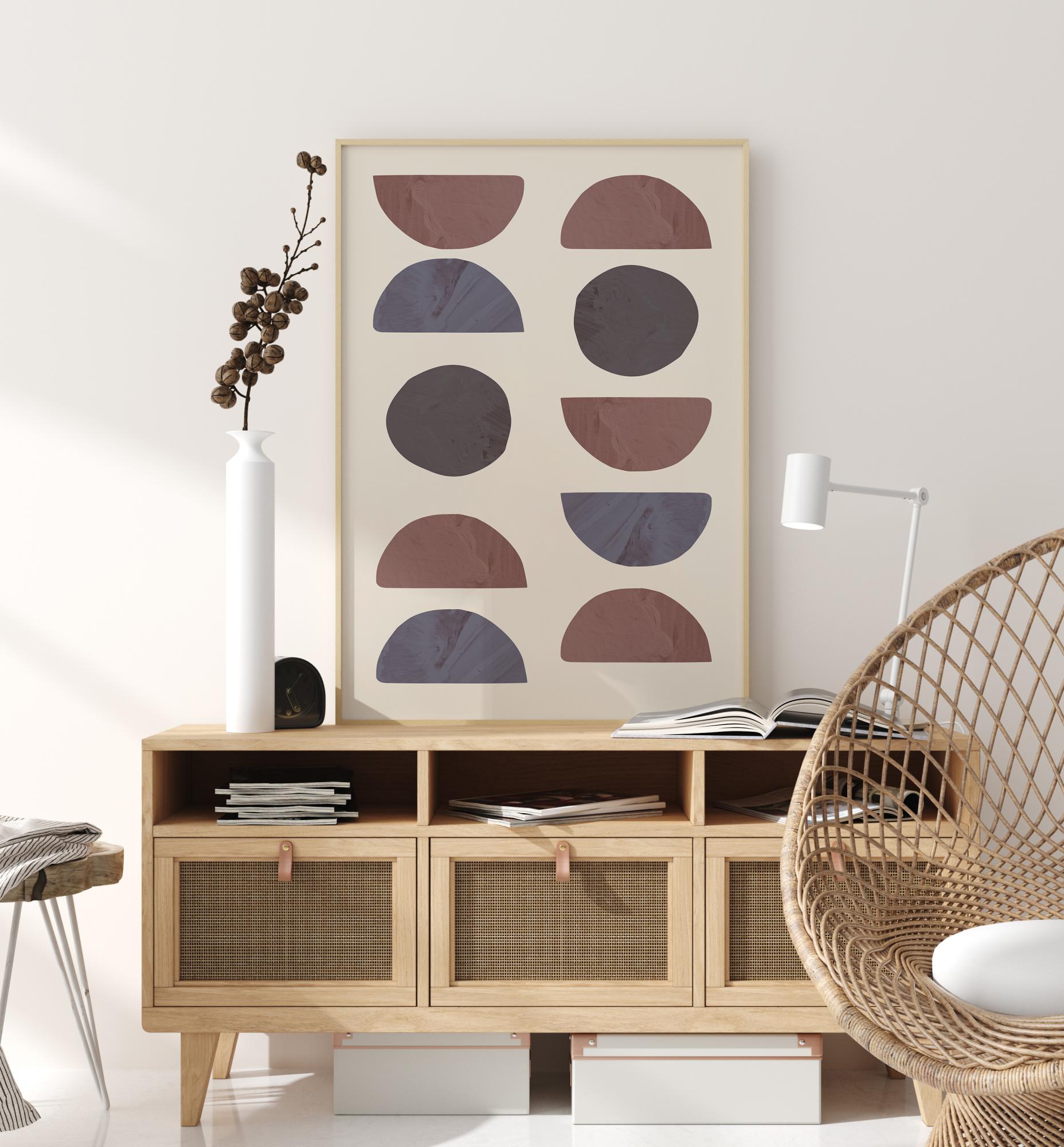 Abstraktni plakat, napolnjen z različnimi polkrogi in krožnimi oblikami. Obstajata dve vrsti oblik z različnimi vzorci krogov in polkrogov, vse v različnih odtenkih modre, sive in rdeče. Poživite preprosto steno v hiši s temi geometrijskimi oblikami.