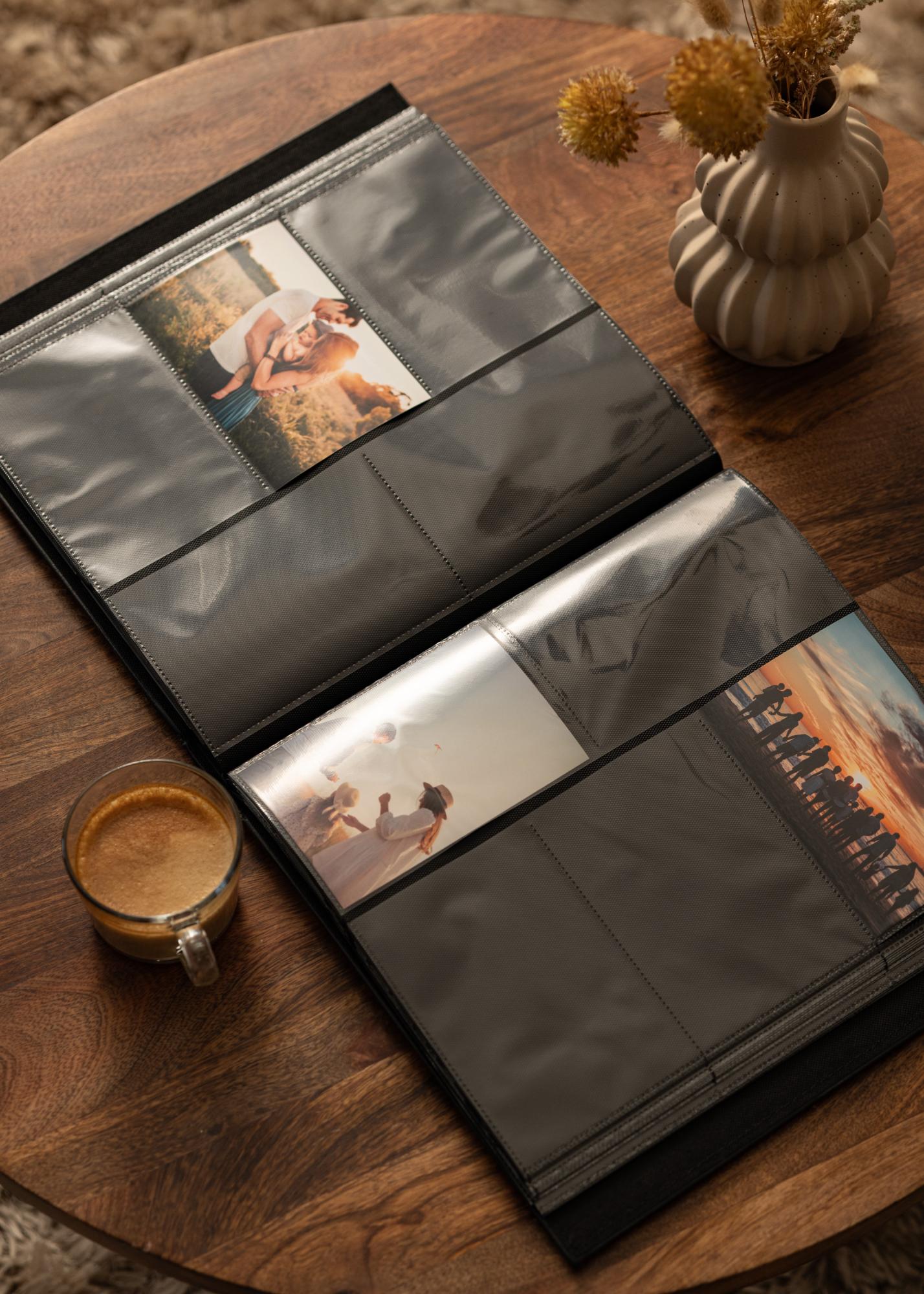 Edinstvena lastnost tega fotoalbuma so njegove praktične žepe za fotografije, kar omogoča enostavno nameščanje in zamenjavo slik brez težav. Orientacija slik v albumu je tako ležeča kot stoječa, kar vam daje prilagodljivost, da uredite svoje slike, kot želite. Črne strani ustvarjajo čudovit kontrast z vašimi barvitimi fotografijami in poudarjajo vsako sliko na najboljši način.