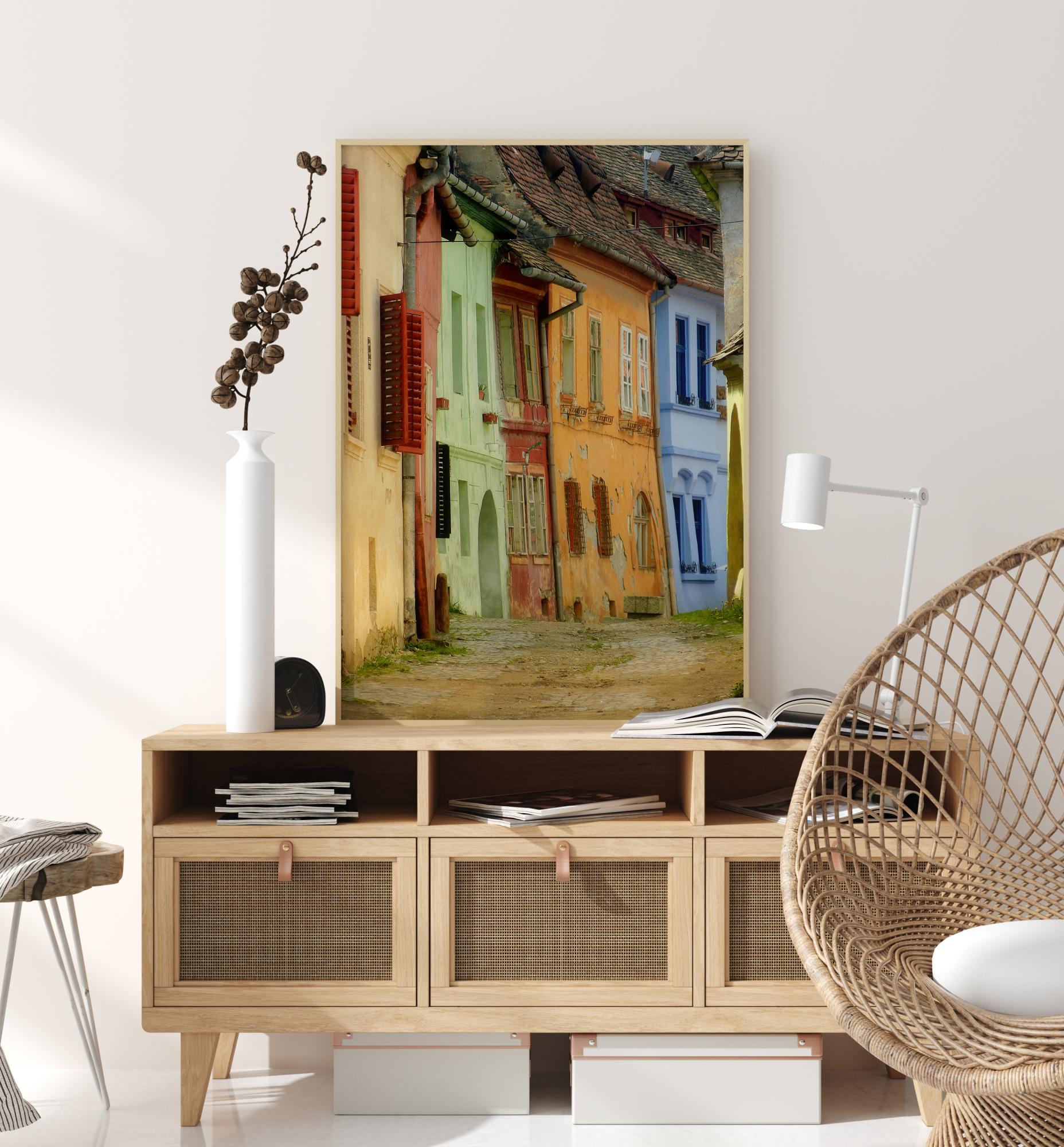 Čudovit plakat s starimi, vendar pisanimi hišami ob ozki ulici. Ulica s tlakovci vodi med bež, zelenimi, oranžnimi in modrimi hišami z opečnatimi strehami ter širokimi odprtimi rdečimi polkni. Uživajte v slikoviti, mirni atmosferi tega očarljivega slikovitega prizora.