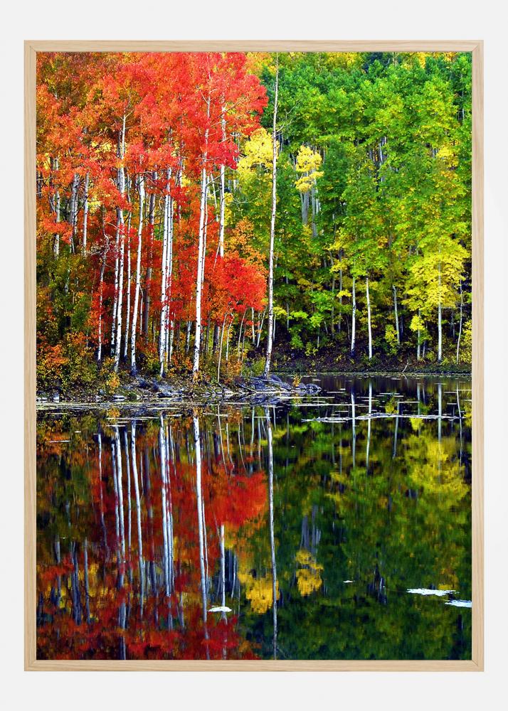 Svetel plakat z jezerom, obkroženim z drevesi. Pomlad in jesen se srečata na tej barviti sliki z rdečimi listi na levi in zelenimi na desni. Vsi mečejo svetel odsev proti vodi jezera v mirni, a vseeno barviti sceni. Prinesite veselje narave v svoj dom s pomočjo tega tiska.