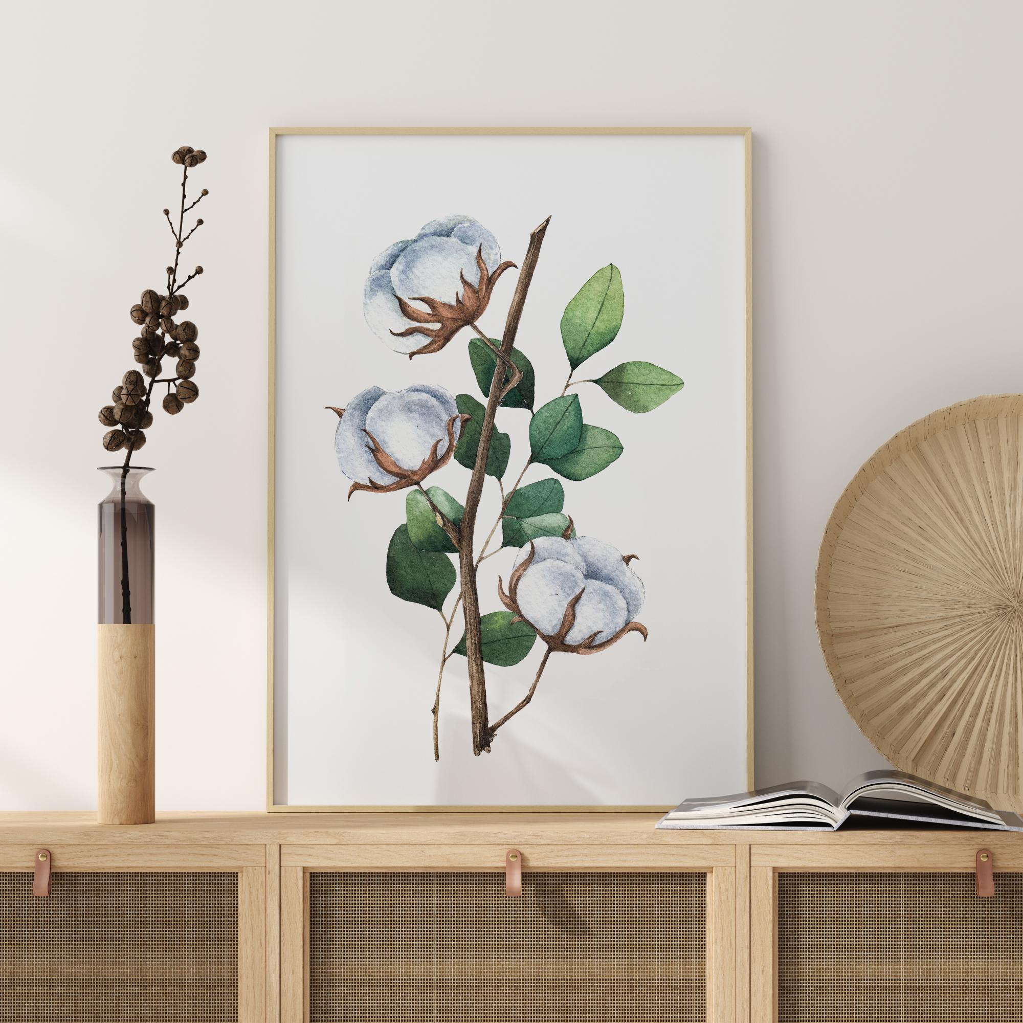 Ilustrativni plakat z enim samim bombažnim cvetom. Ta umetniška botanična ilustracija previdno izpostavlja veliki bombažni cvet na čisti beli podlagi. Obesite to sliko doma in se počutite kot cvetoči botanik.