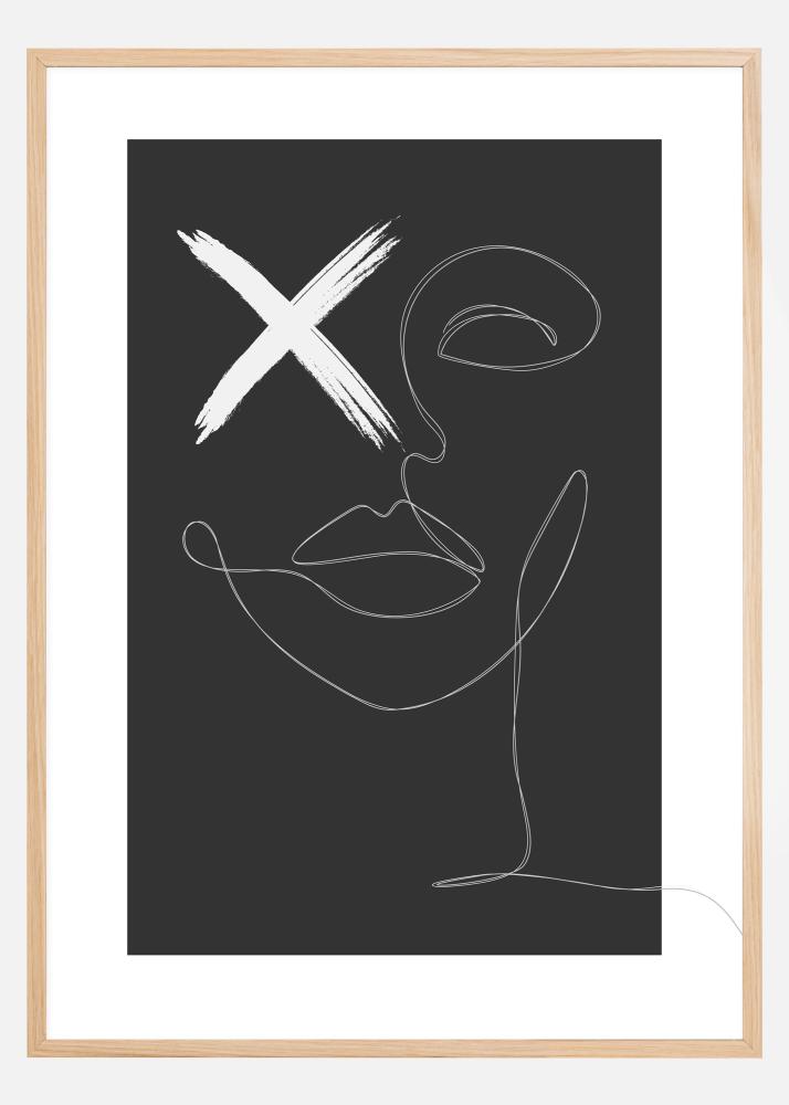 Abstrakten plakat z obrazom, narisanim s tankimi belimi linijami na črnem ozadju. Bele linije so vse povezane, da ustvarijo obraz v enakomernem gibanju. Kjer bi moralo biti oko, se nahaja dramatičen bel križ. Kaj to pomeni? Obesite to delo na osrednje mesto za umetniško razpravo doma.