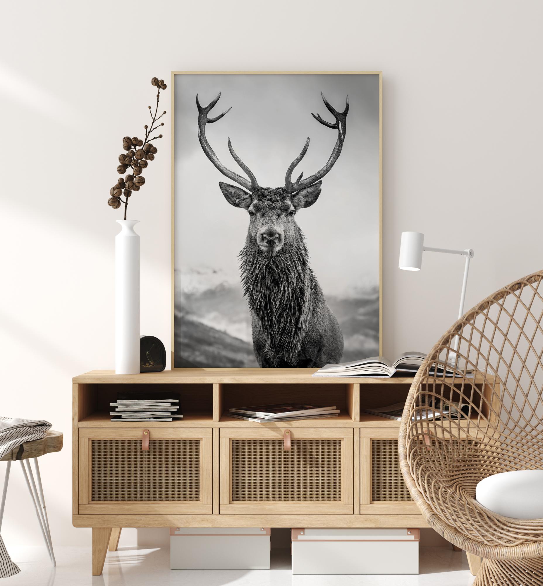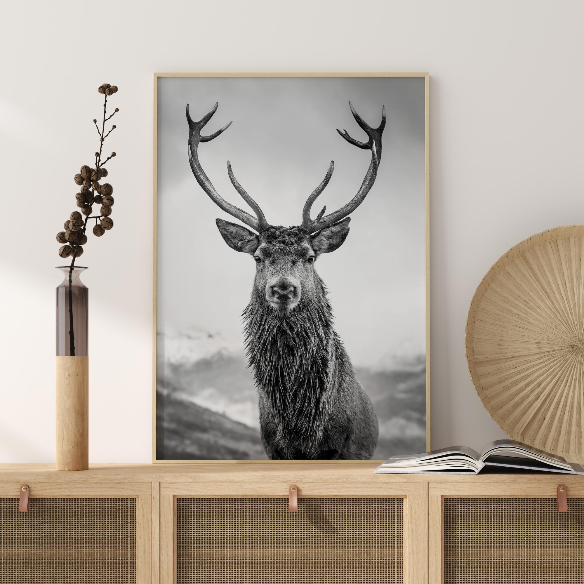 Kraljevski poster z rdečim jelenom. Radovedni jelen zre naravnost v kamero s svojimi rogovjem, ki dramatično razvejano v oblake na nebu. V ozadju so valoviti hribi. Ta črno-bela tiskovina resnično zaživi na zeleni ali modri steni.