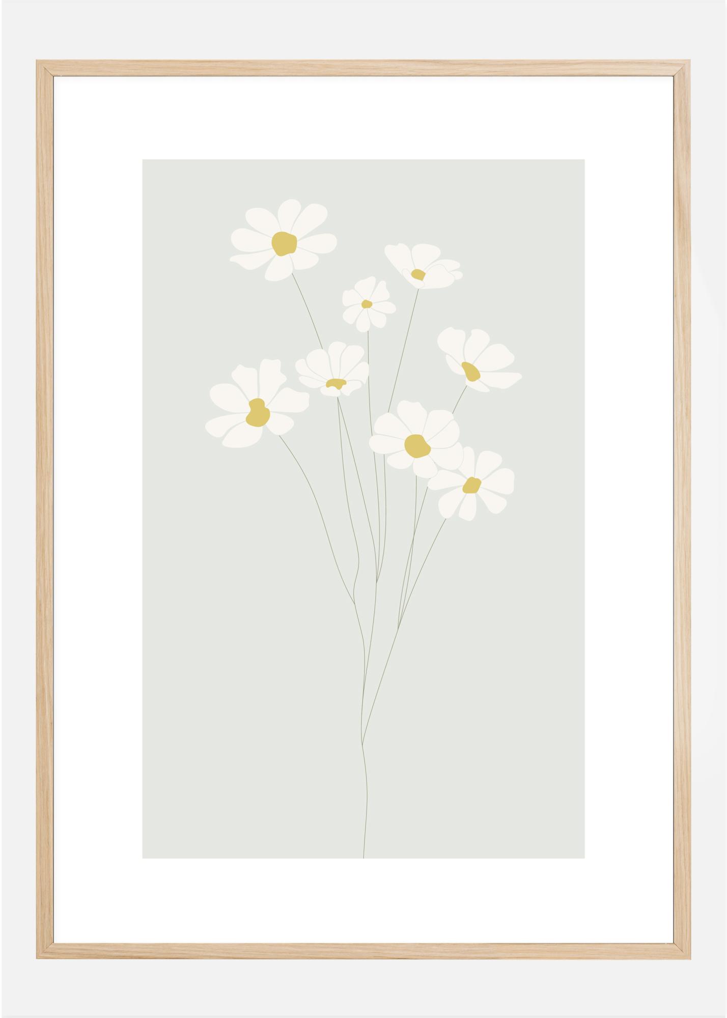 Subtilen plakat s potiskom marjetice z nežnim videzom. Enostavni beli in rumeni cvetovi se raztezajo navzgor na tankih steblih proti mehki zbledeli modri podlagi. Obešajte to sliko v otroški spalnici za pomirjujoče, a sladko vzdušje.