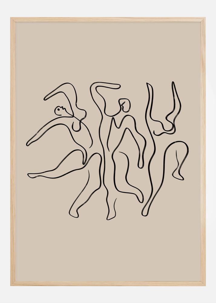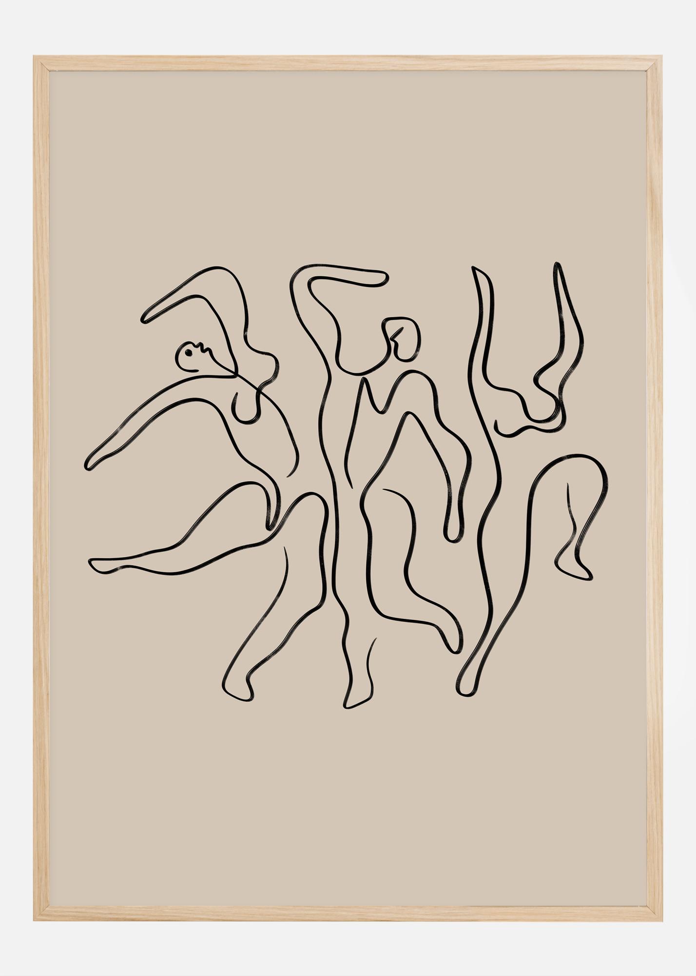 Ta umetniški plakat predstavlja serijo abstraktnih figur, ki s svojimi tekočimi linijami prinašajo občutek gibanja in plesa. Preprosta, a izrazna ilustracija v črni barvi na umirjenem bež ozadju ponuja minimalističen, a živahen izraz. Ta vrsta motiva je popolna za tiste, ki cenijo subtilne, a močne umetniške izdelke, ki navdihujejo gibanje in svobodo.