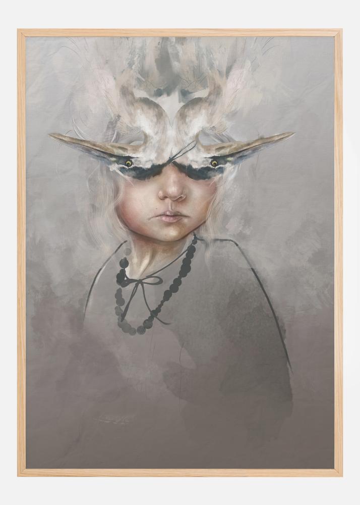 Grozljiv plakat z osebo, zavito v dim. Glavo pokriva klobuk, ki izgleda, kot da gori in spominja na dve obrnjeni ptici ali lobanjo. Oči so skrivnostno zasenčene in oseba izžareva skrivnosten mir. Obesite to delo v vašem domu in omogočite nadaljnje interpretacije.